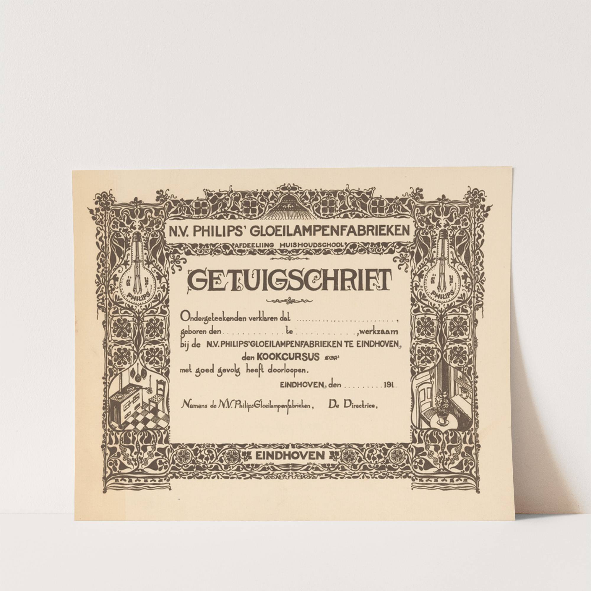 Getuigschrift van de kookcursus bij de Philips Huishoudschool by Theo Nieuwenhuis  - Wall Art Print
