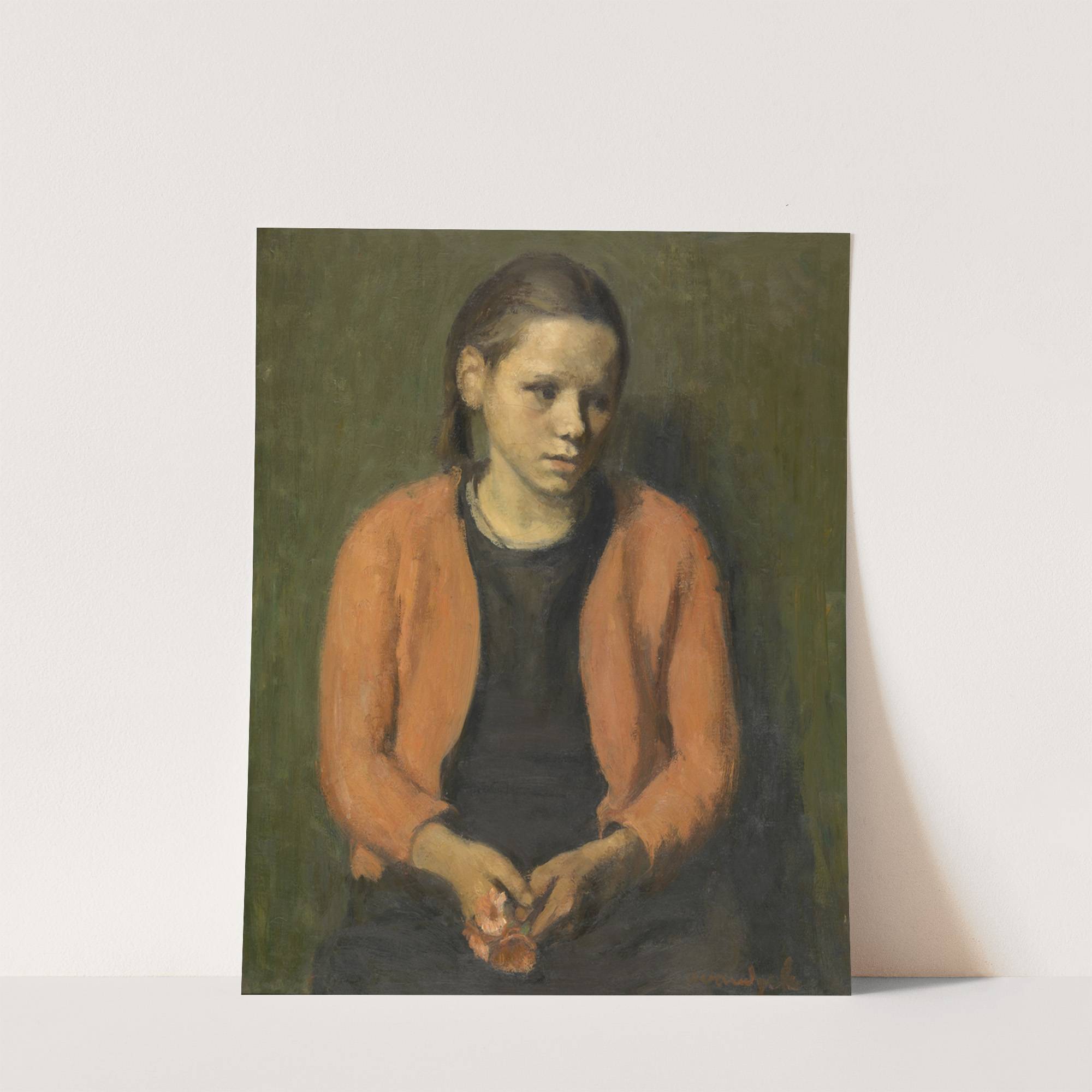 This artwork, titled "Girl from the Kempen" by Albert Van Dyck, is a striking portrait painted in an impressionistic style. The young girl, with fair skin and dark brown hair pulled back into a simple ponytail, gazes She wears a...
