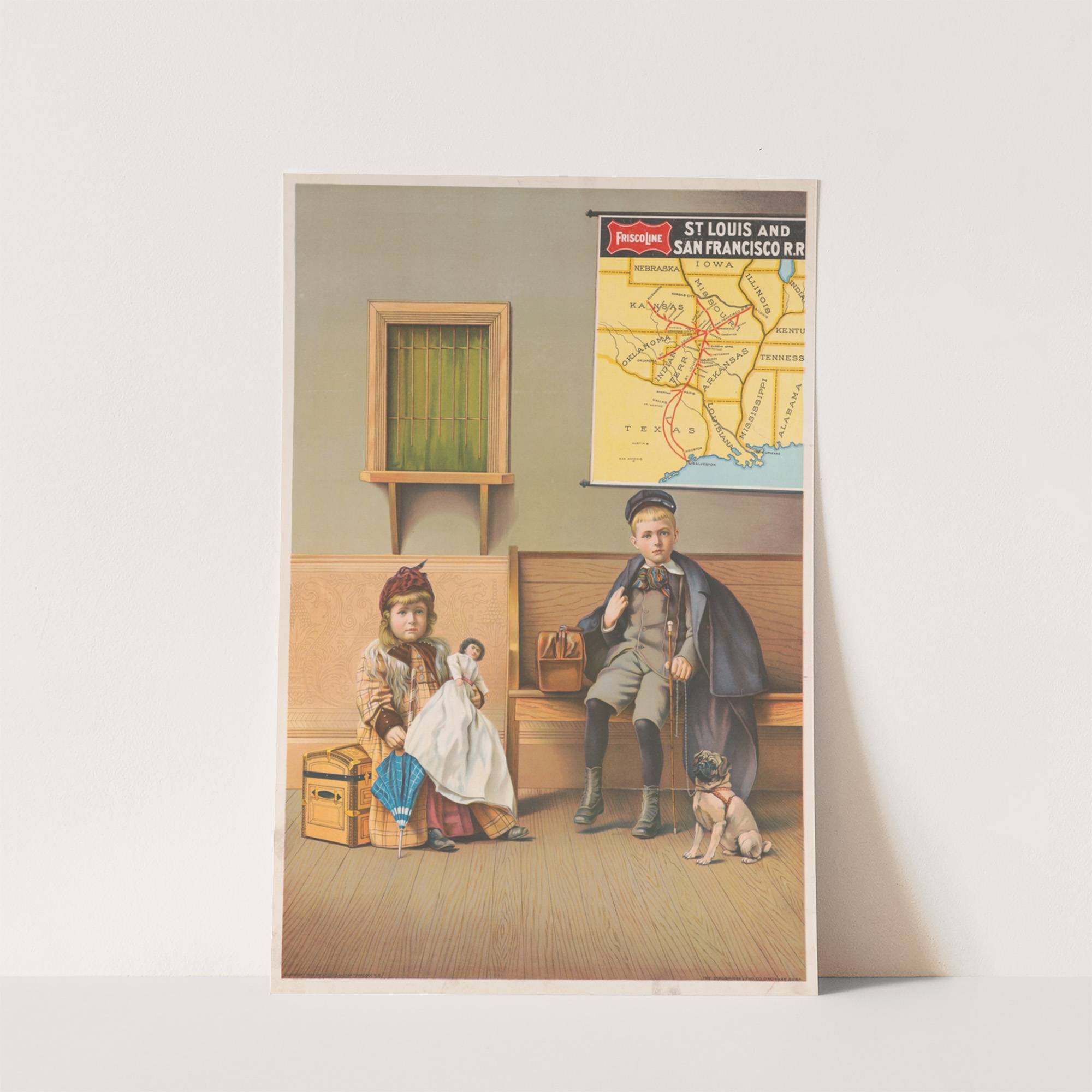 Girl holding doll and boy with dog in waiting room at railroad station (1899) by Strobridge & Co. Lith. - Wall Art Print