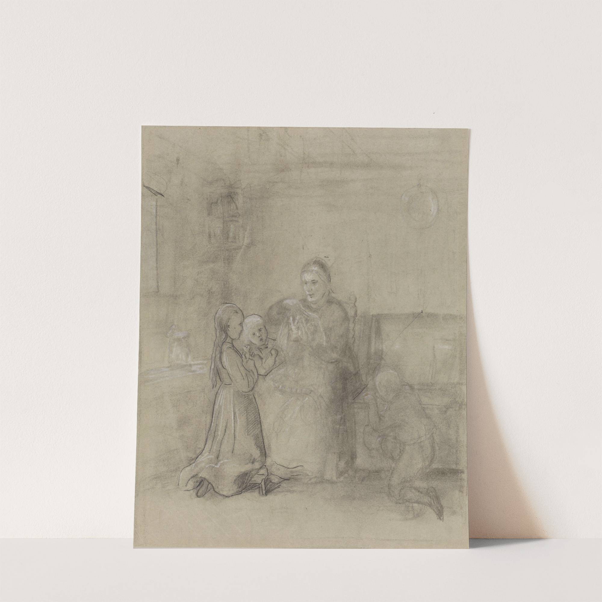 This delicate pencil sketch depicts "Grandma's Bridal Crown" by Adolph Tidemand, capturing a tender family moment with fine, subtle strokes. The scene centers on a young girl with long hair, kneeling to the left and holding a small child cradled...