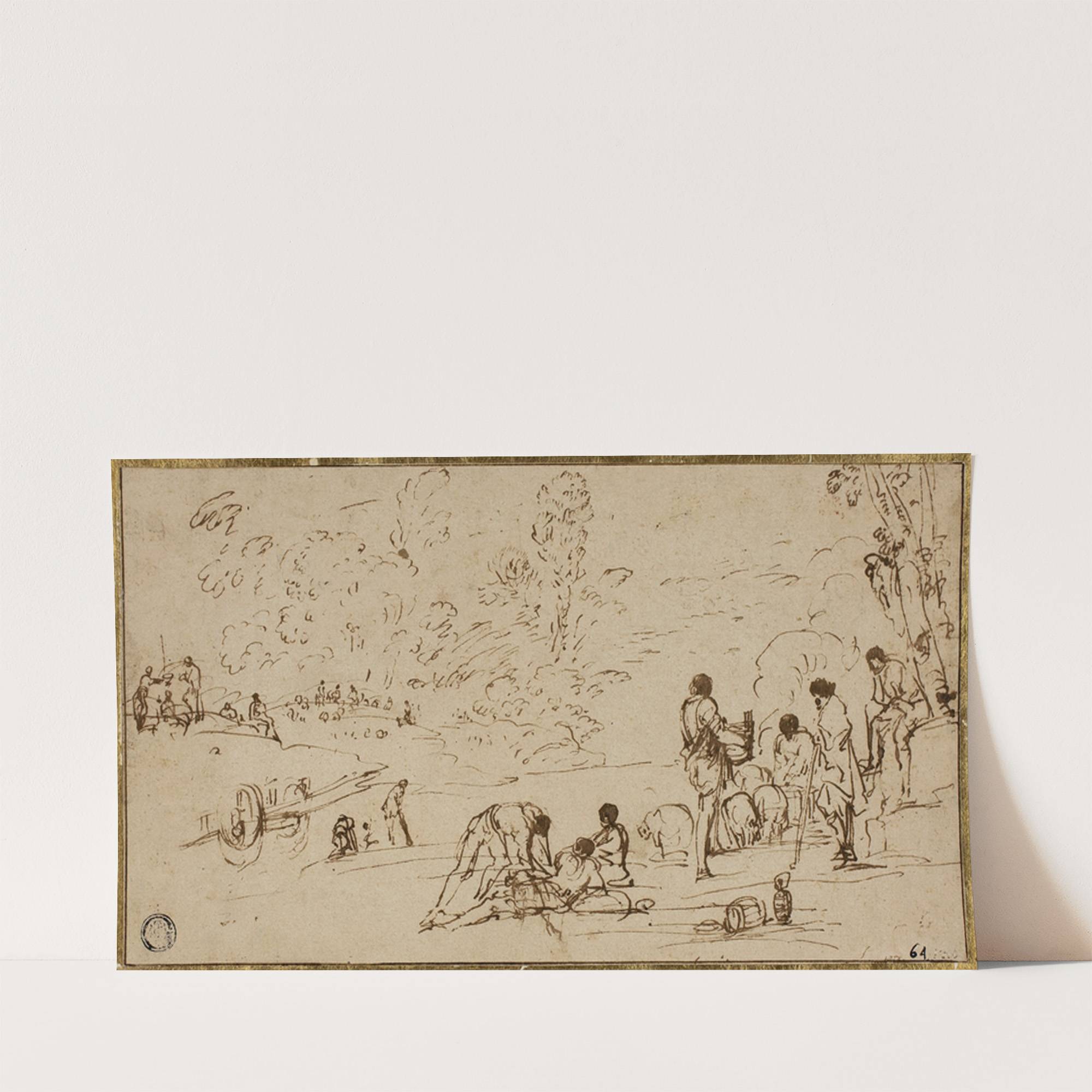 This is "Group of Figures by a River" by Agostino Tassi, a classic black-and-white sketch that captures a serene riverside scene in exquisite detail. The image features a group of people engaging in various activities along the riverbank. In the...