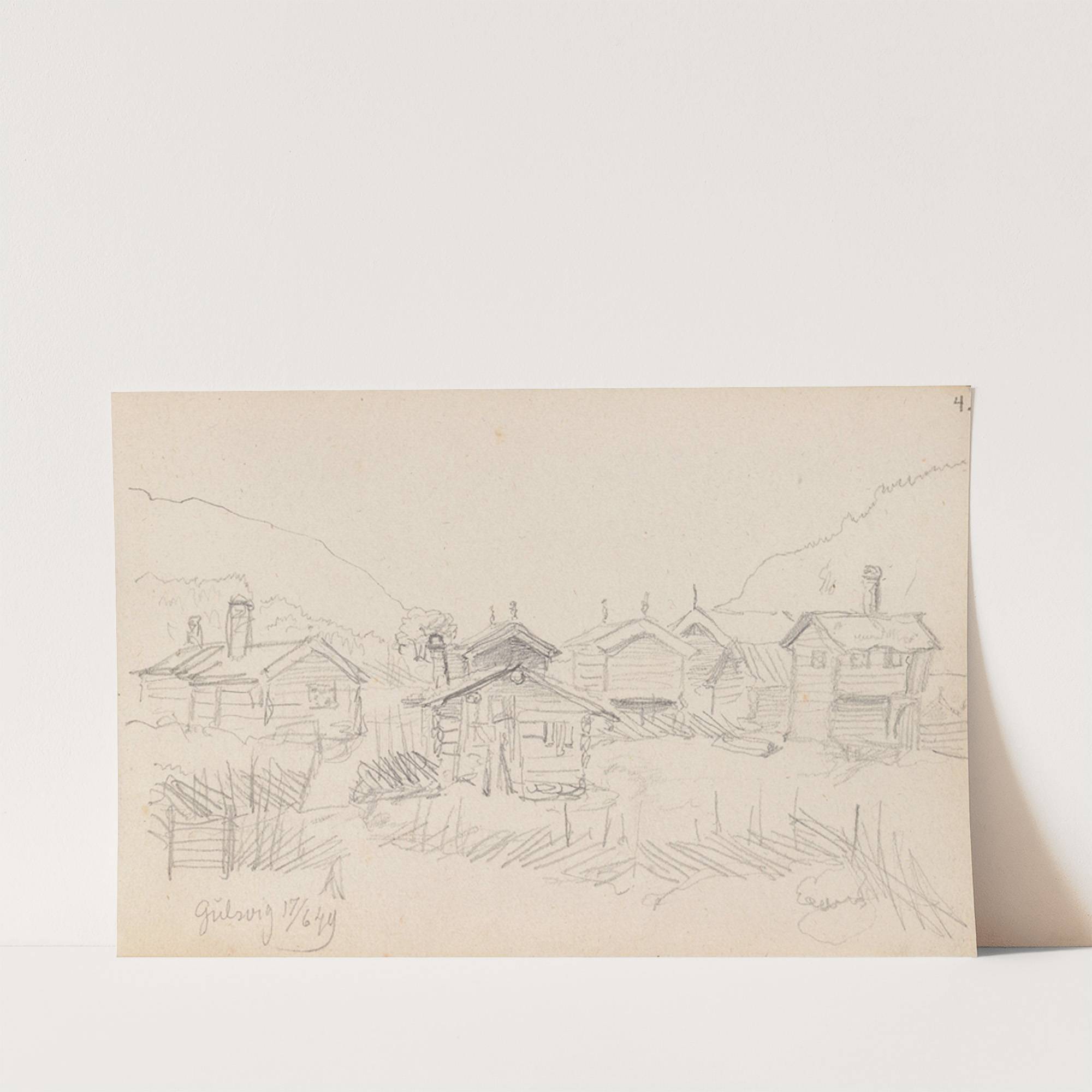 This monochromatic line drawing features a quaint rural village scene created in a minimalistic style by the artist Adolph Tidemand, as noted in the signature "Gulsvik" dated "1849". The artwork is characterized by delicate pencil strokes that depict a row...