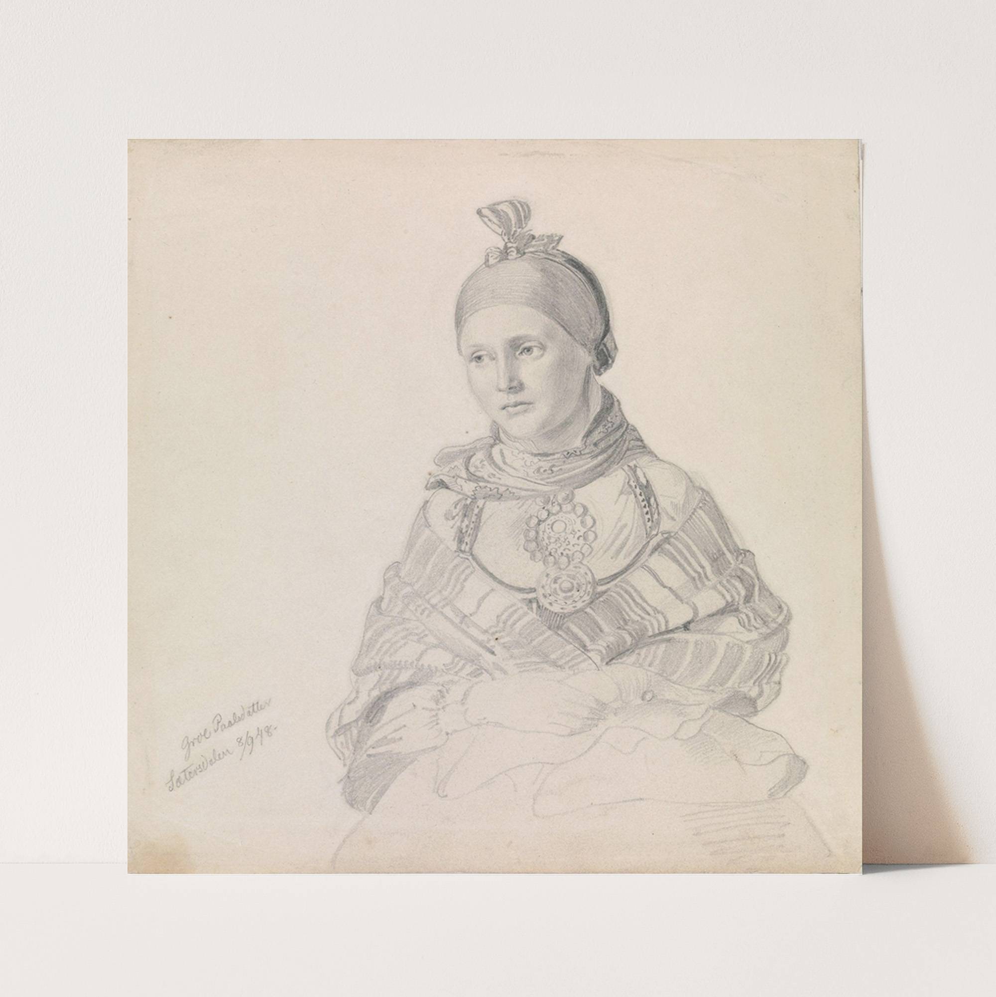This exquisite black-and-white pencil drawing captures the refined elegance of a historical portrait attributed to Gyrolfsdatter Nomeland as depicted by Adolph Tidemand in 1848. The subject, a woman with a calm and composed expression, is dressed in period-specific attire characterized...