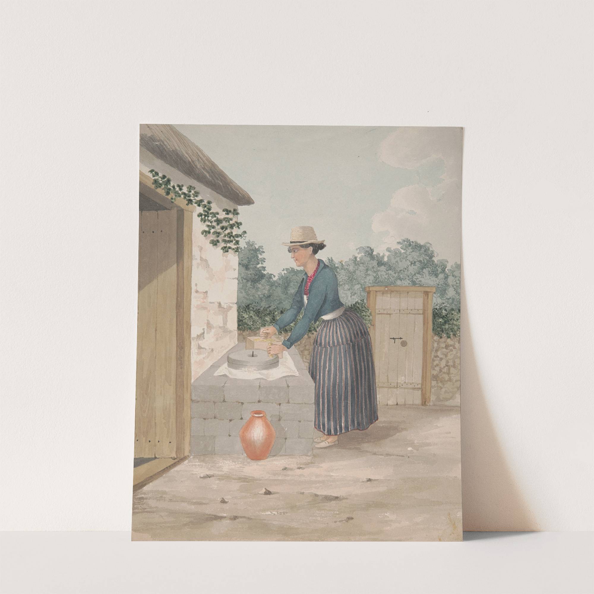 This charming watercolor print depicts a serene rural scene featuring a woman engaged in grinding gofio at an outdoor mill. The woman is dressed in traditional attire with a teal blue blazer over a white blouse and a long, striped...