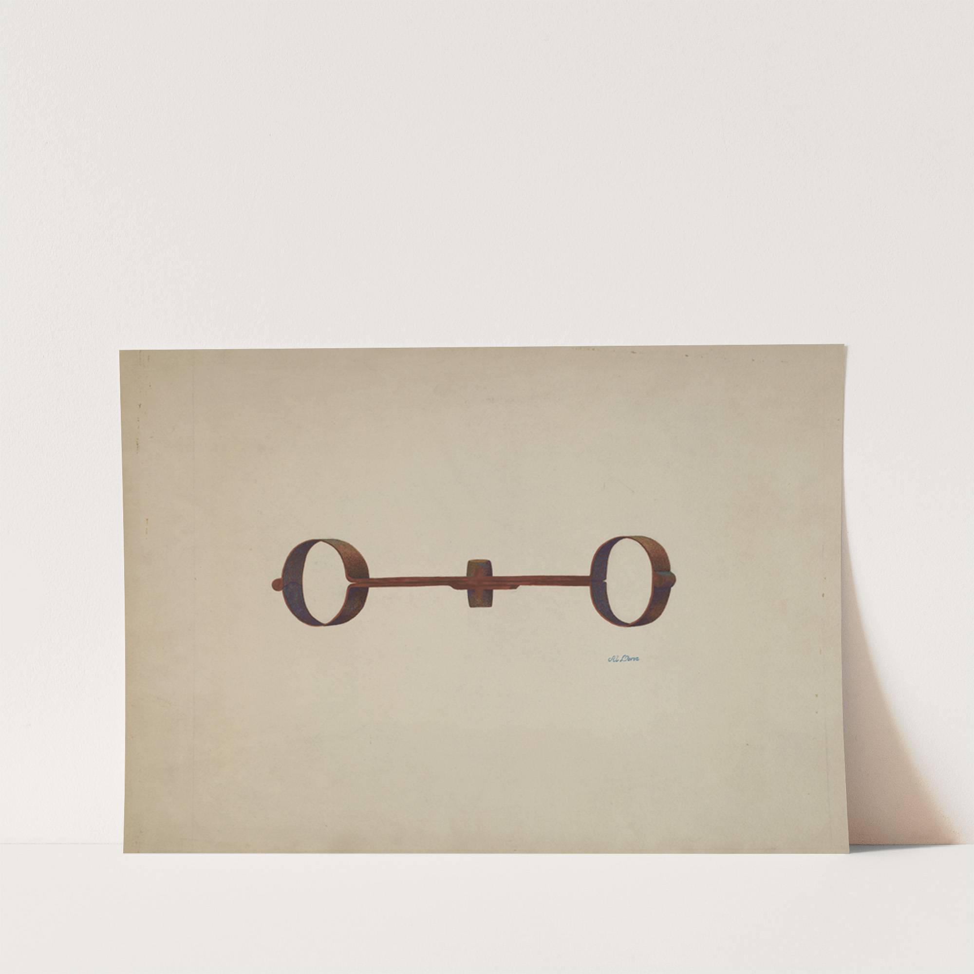 This art print features "Handcuffs" by artist Al Curry, presented in a minimalist style. The central subject is two circular metal rings connected by a horizontal rod with a small central hinge. The rings are rendered in a deep rust...