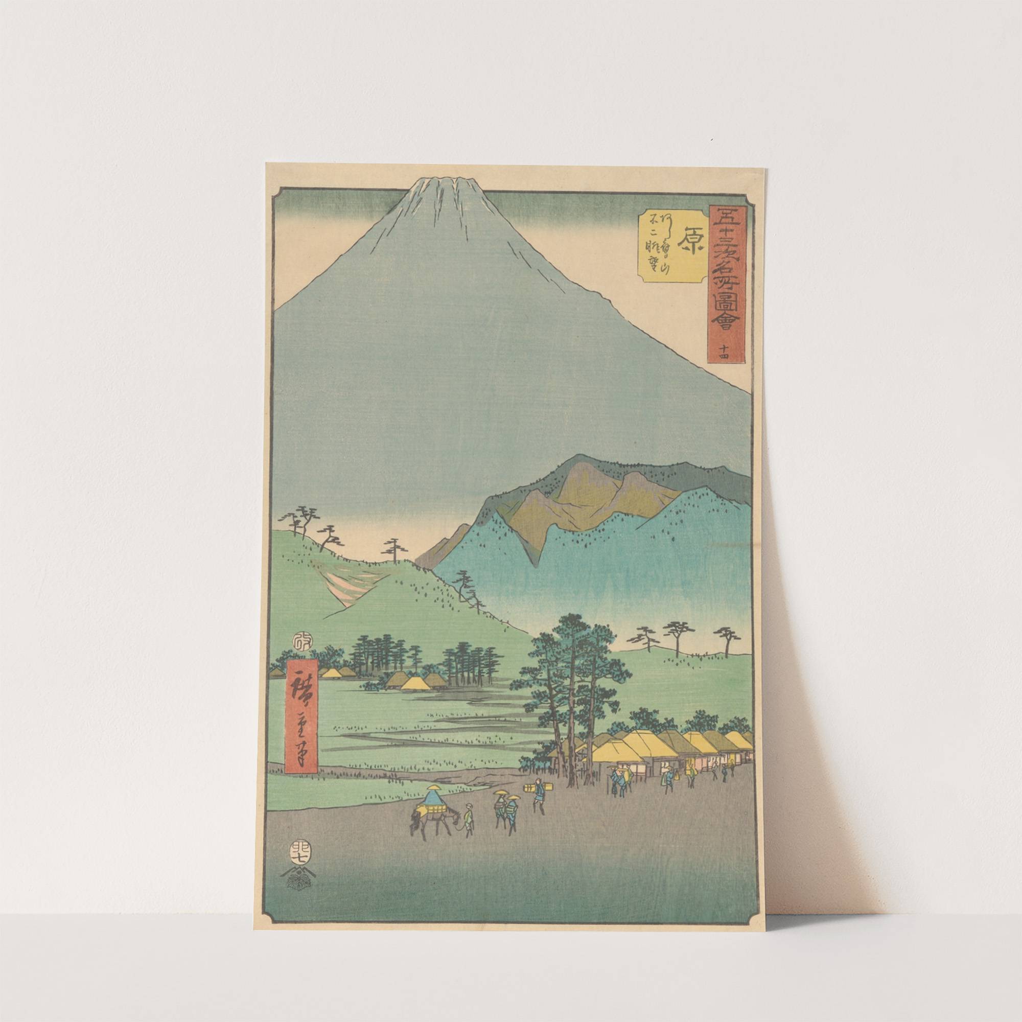 This beautiful art print features "Hara" by the renowned artist Andō Hiroshige, showcasing his signature ukiyo-e style with meticulous attention to detail and vibrant color. The composition depicts a serene landscape scene set against a majestic mountain backdrop with a...