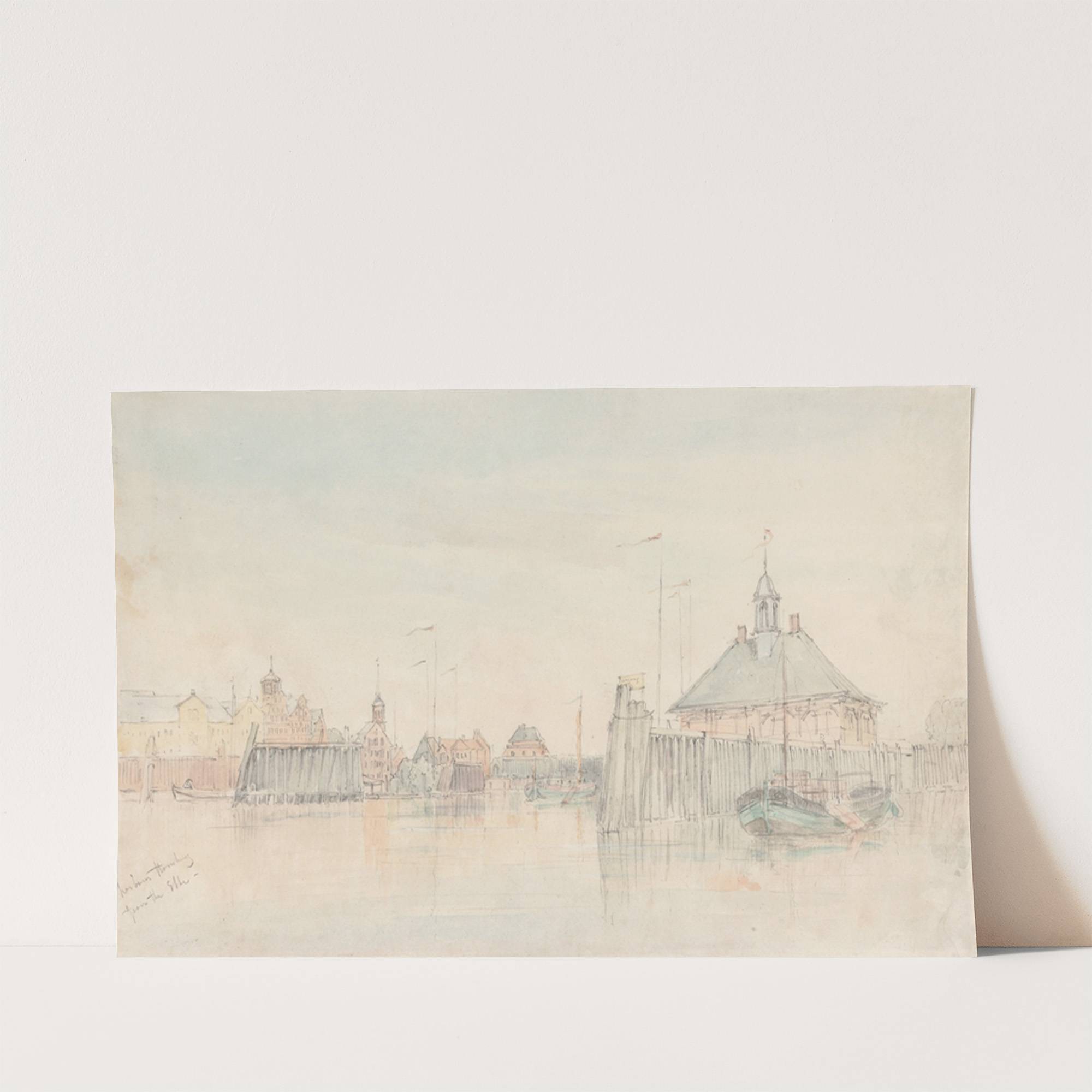 This art print features "Harbour, Hamburg from the Elbe" by Alfred Gomersal Vickers. The painting uses a delicate watercolor technique with light, pastel hues to depict a tranquil harbor scene. The central focus is on an intricate building with a...
