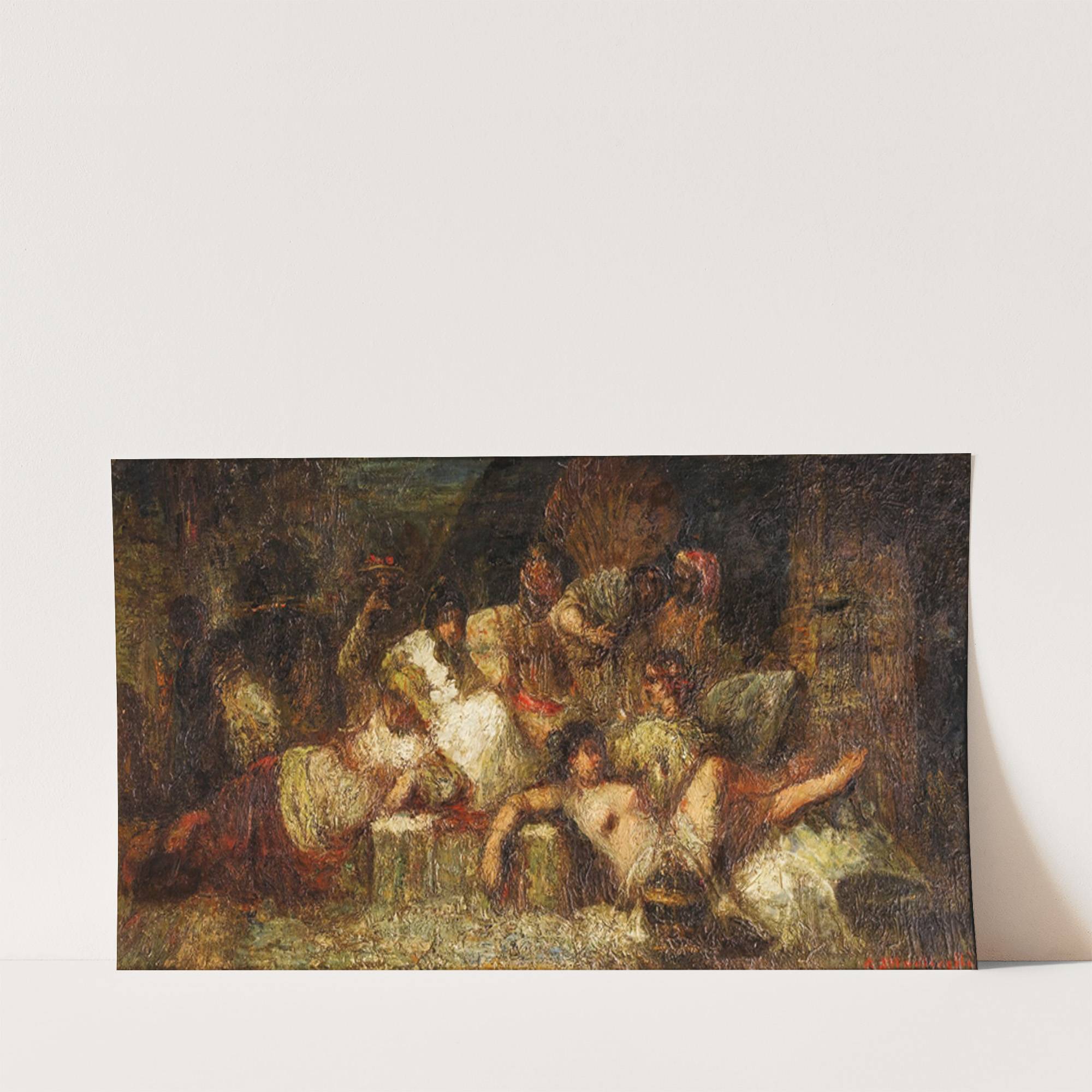 This captivating artwork titled "Harem Scene" by Adolphe Monticelli showcases an exquisite blend of classical realism with rich, warm colors. The painting depicts a lively group of figures in a harem setting. Central to the composition is a semi-nude woman...