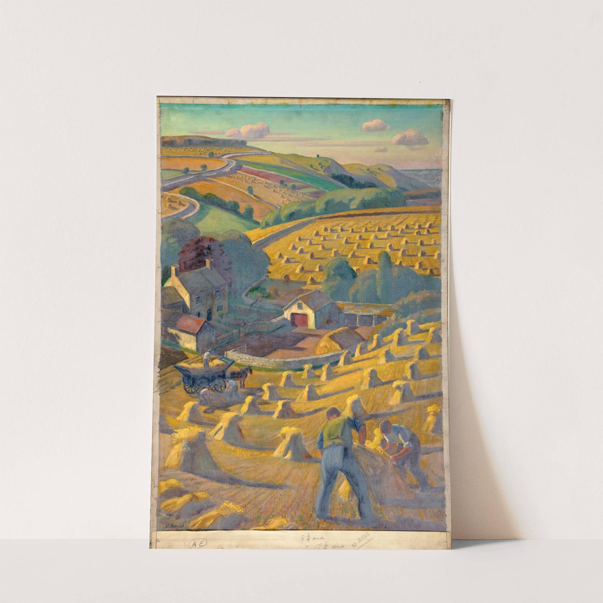This vibrant artwork titled "Harvesting" by Adrian Allinson brings a rustic countryside scene to life with vivid, impressionistic brushstrokes. The painting features an idyllic rural landscape under a bright, golden sunlight that casts warm hues across the rolling hills and...