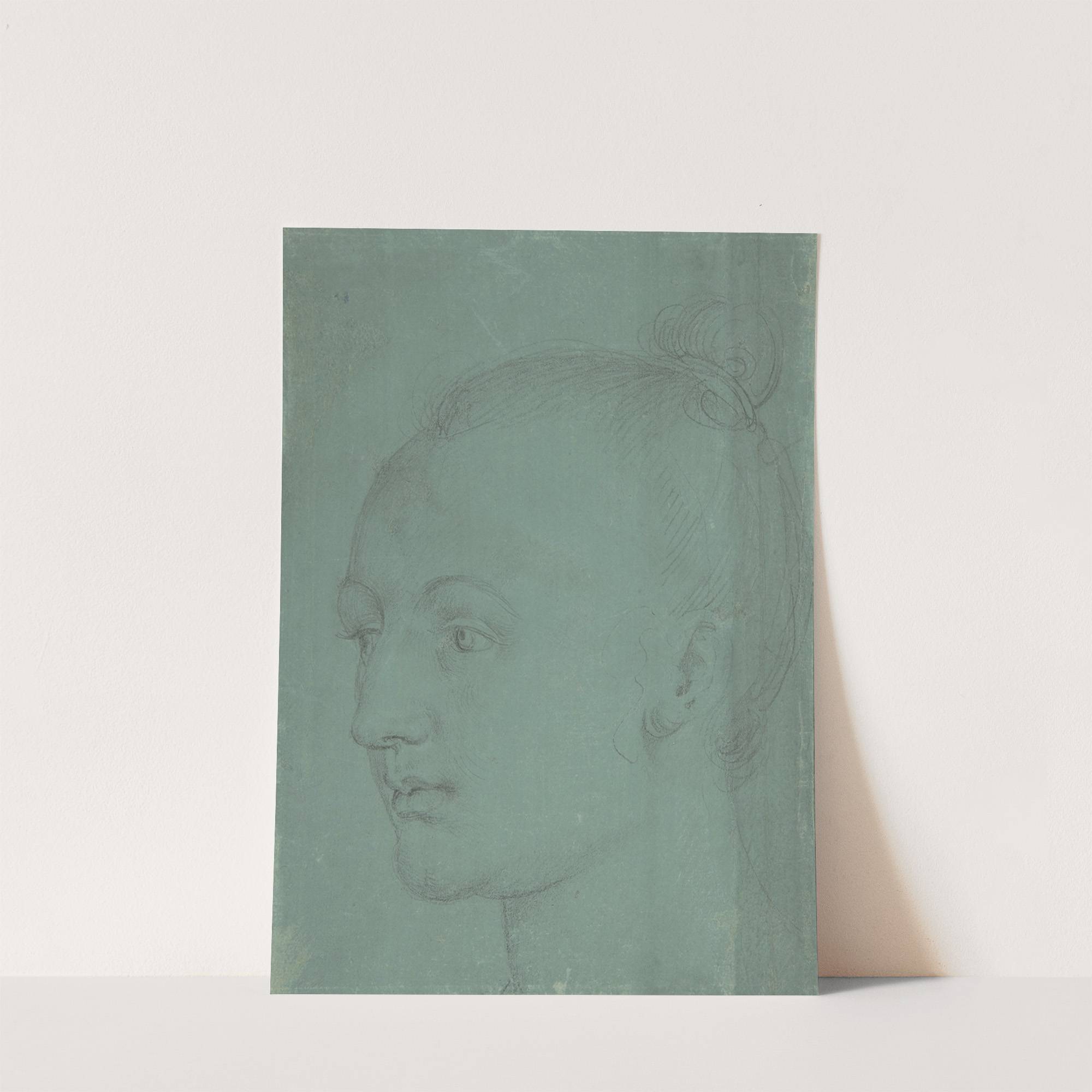 This exquisite print is a delicate pencil sketch titled "Head of a Young Woman" by Albrecht Dürer, created in 1522. The artwork showcases the profile of a young woman with gentle, expressive features and an attentive gaze. Her hair is...