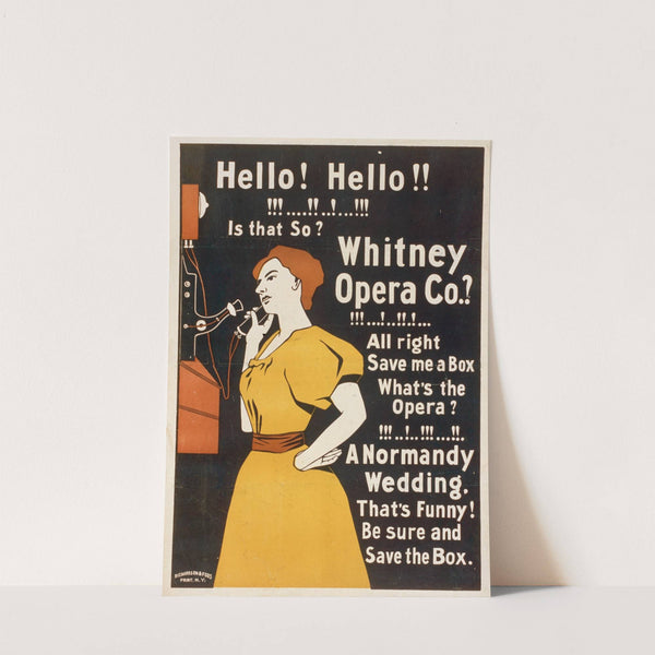This vibrant art print features an illustration from the vintage movie poster of "Hello Dolly!" directed by George Cukor. The artwork showcases a stylish woman in a bright yellow dress with short sleeves, holding a black telephone receiver to her...