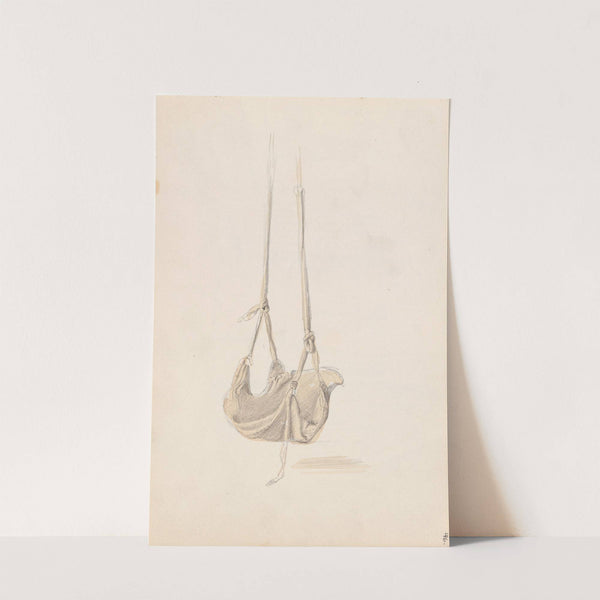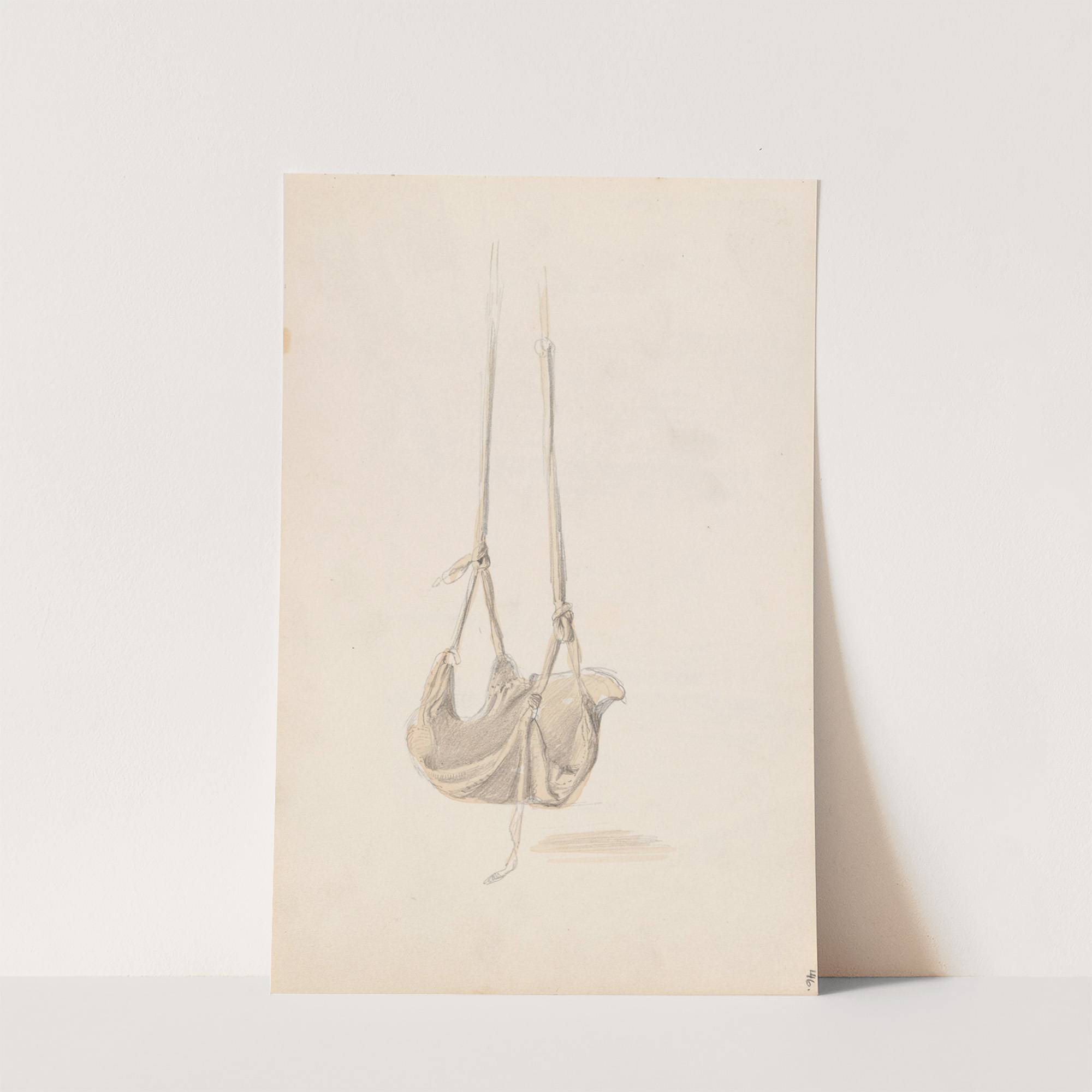 This delicate monochromatic artwork by Adolph Tidemand, titled "Hengevugge" (1852), showcases two traditional Norwegian swing seats suspended in mid-air against a stark white background. The minimalistic composition focuses on the subtle, yet expressive, line work of the swings and their...