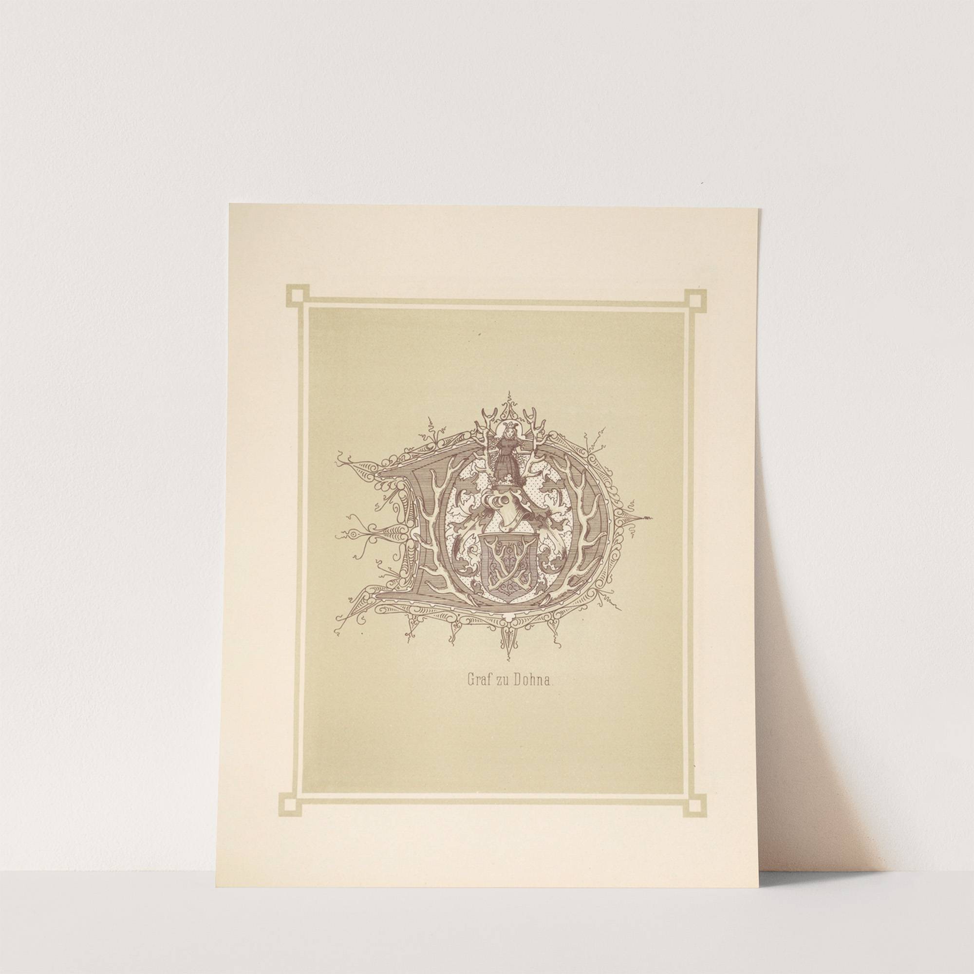 Introducing "Heraldic Alphabet Pl.05 (1884)" by Adolf Matthias Hildebrandt, a masterful piece of historical illustration with a delicate and intricate design. This sepia-toned artwork features an ornate, circular emblem at its center, surrounded by elaborate, intertwined patterns that evoke a...