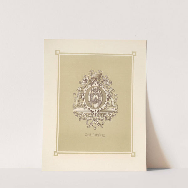 This elegant art print features "Heraldisches Alphabet Pl.15" by Adolf Matthias Hildebrandt, showcasing intricate Victorian-style heraldry. The central design includes a detailed circular emblem with a shield in the middle, surrounded by ornate, filigree-like patterns and embellishments. A small crown...
