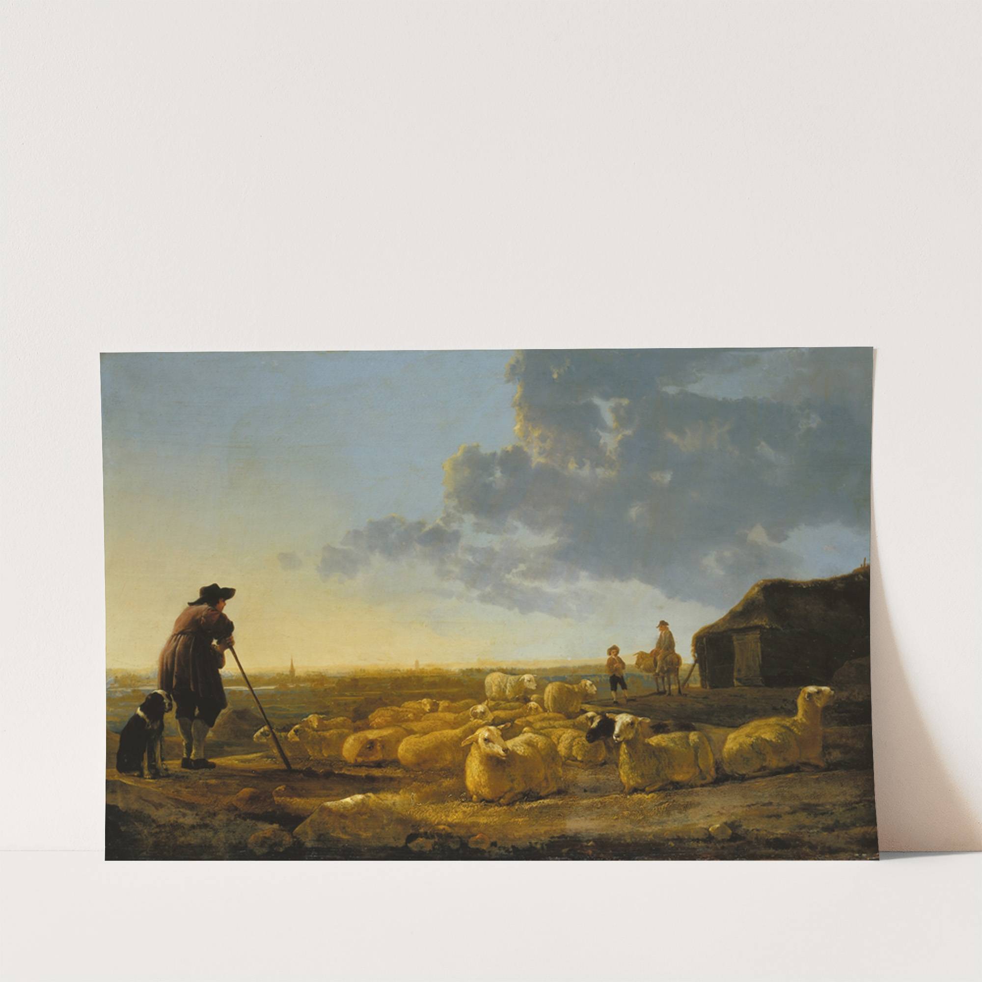 This stunning art print features "Herd of Sheep at Pasture" by Aelbert Cuyp, a masterpiece that exudes warmth and pastoral tranquility. The painting showcases a serene rural scene bathed in golden sunlight with a gentle, cloud-streaked sky overhead. In the...