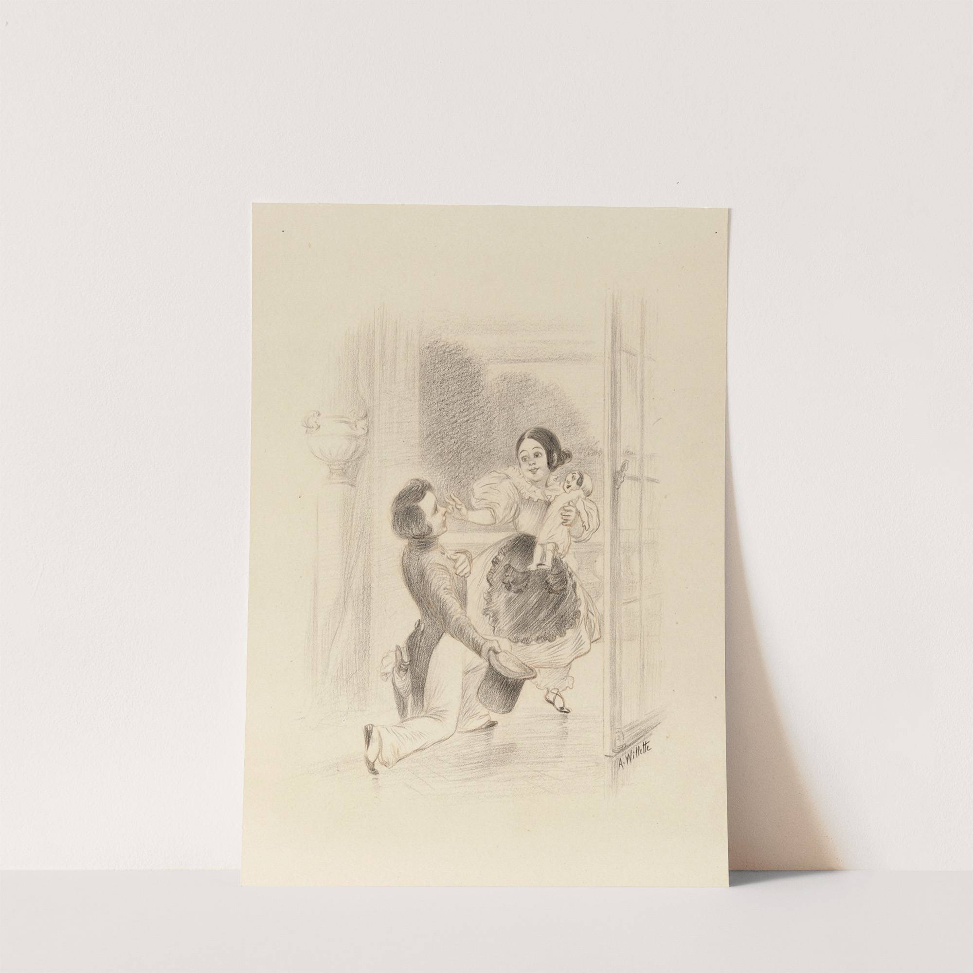 This elegant black-and-white artwork by Adolphe Léon Willette is titled "Hermina" (1897). It captures a tender moment with exceptional detail and a soft, sketch-like quality. The scene features a mother gently holding her baby while another child leans in, reaching...