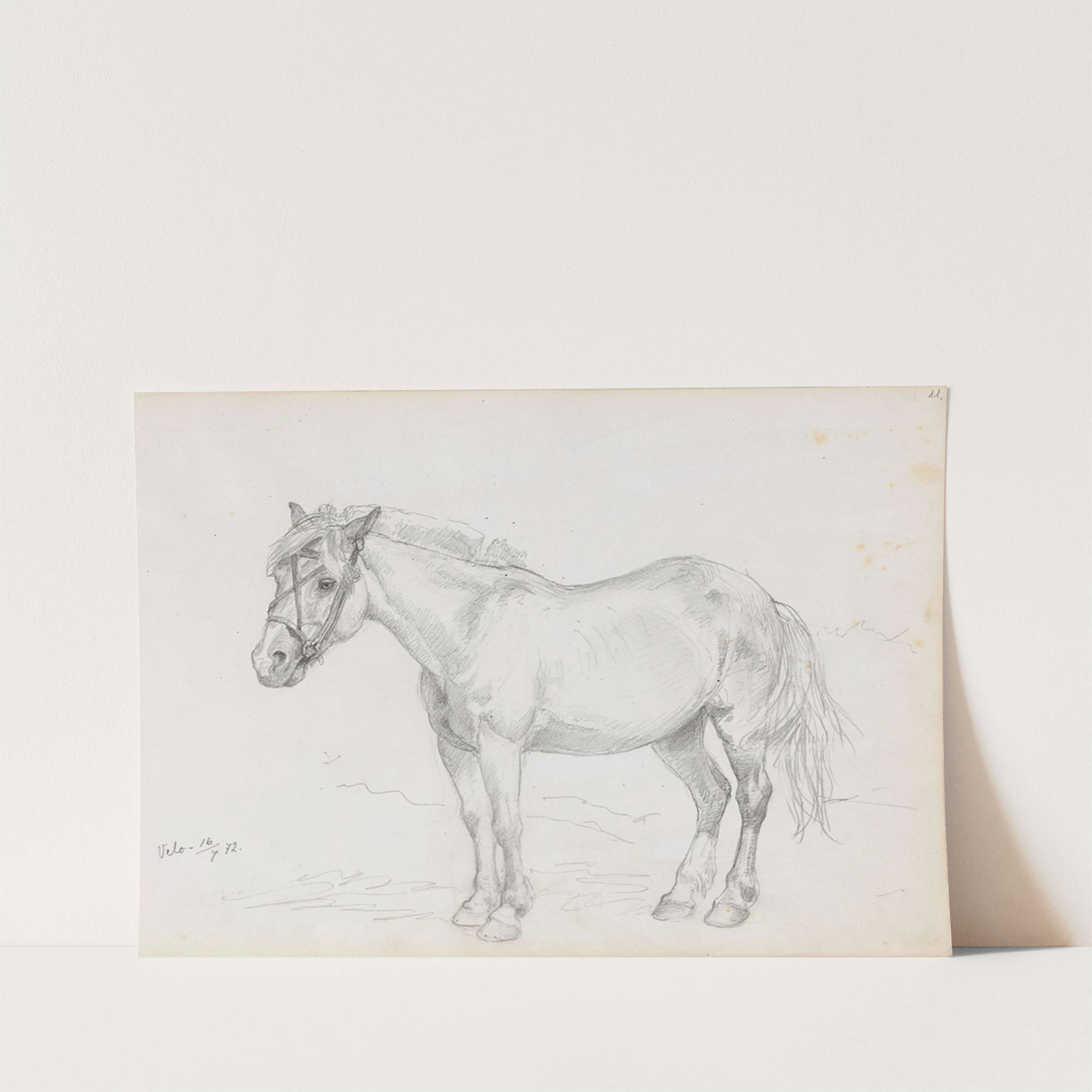 This stunning pencil drawing captures a beautifully detailed horse named Velo, created by artist Adolph Tidmand in 1872. The monochromatic sketch features the horse standing confidently with its head slightly turned to the right, showcasing meticulous shading and line work...