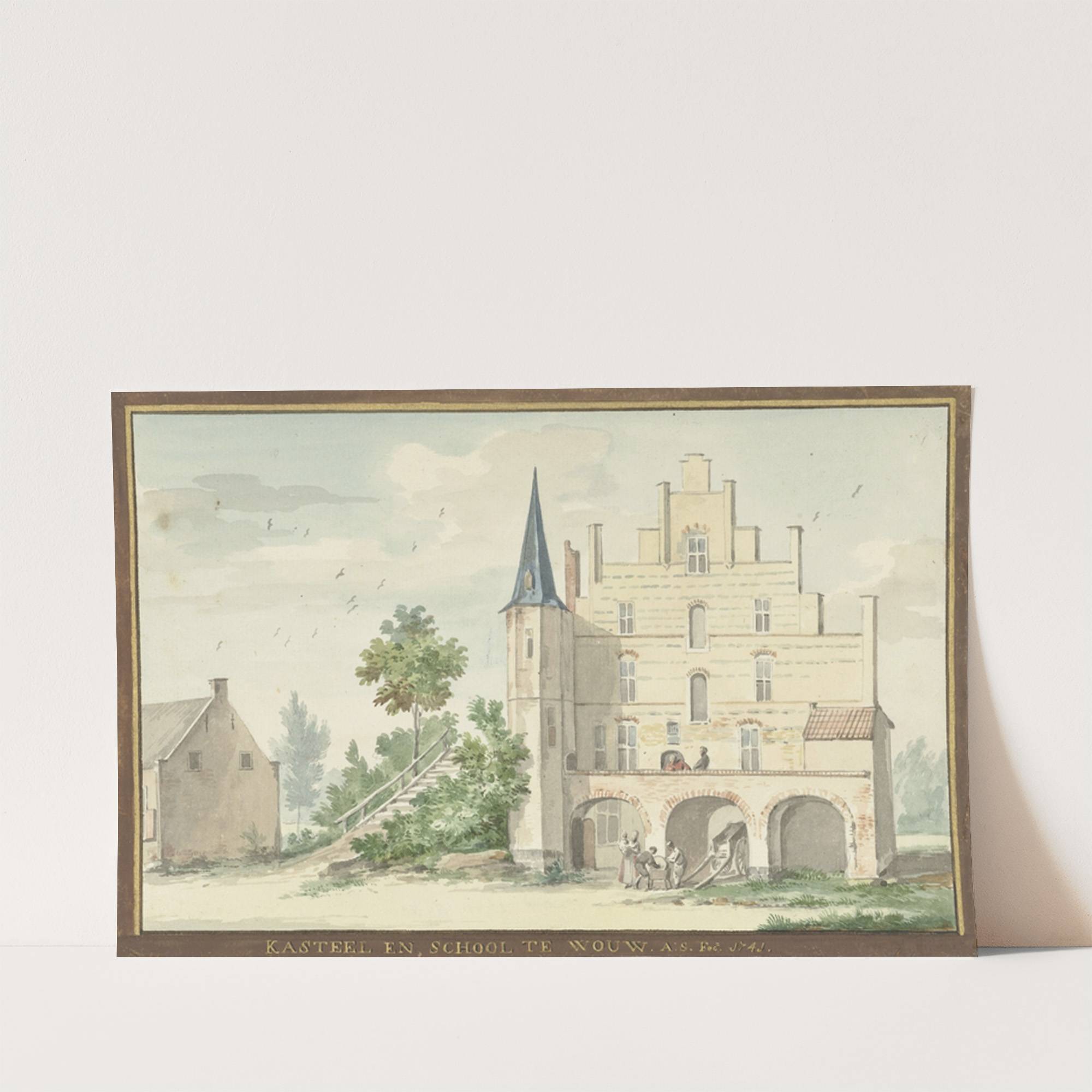 This exquisite print showcases "Het Kasteel en School te Wouw" by the renowned artist Aert Schouman. The artwork captures a serene scene of an elegant medieval castle with beige stone walls and a tall, blue-tipped turret standing prominently on the...