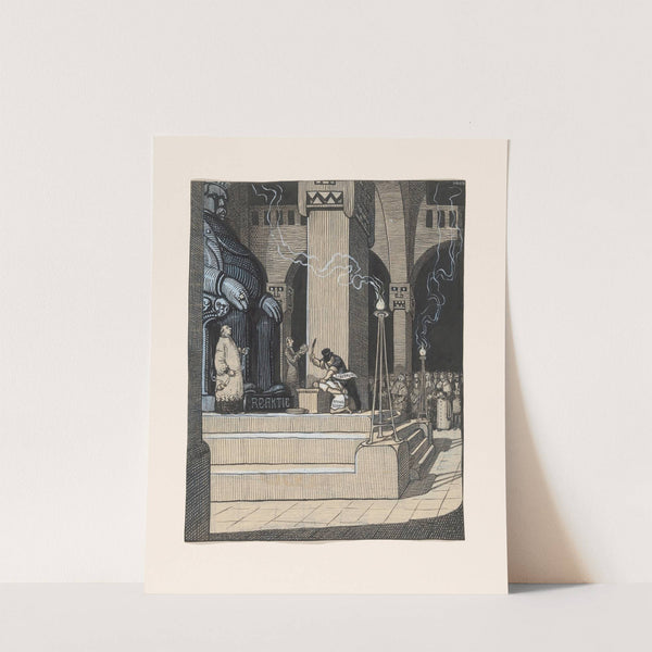This artwork, titled "Offering to the Public School by Liberalism," is a striking piece created by artist Albert Hahn. It features a dynamic scene set within an ancient, temple-like structure with tall arches and pillars. At the center of the...