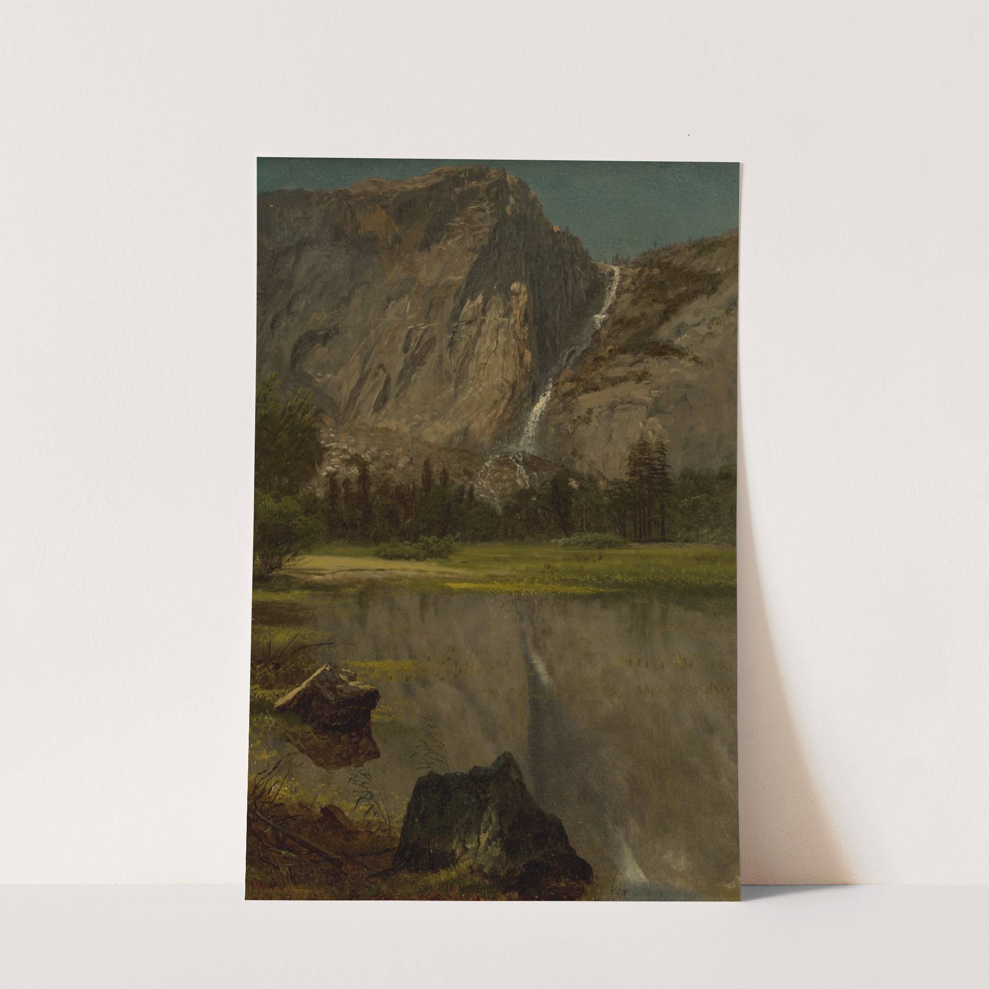 This striking print captures the natural beauty of Hetch Hetchy Falls in California, beautifully rendered by artist Albert Bierstadt. The image showcases a majestic mountain landscape with rugged, weathered cliffs that dominate the upper portion of the composition. A slender...