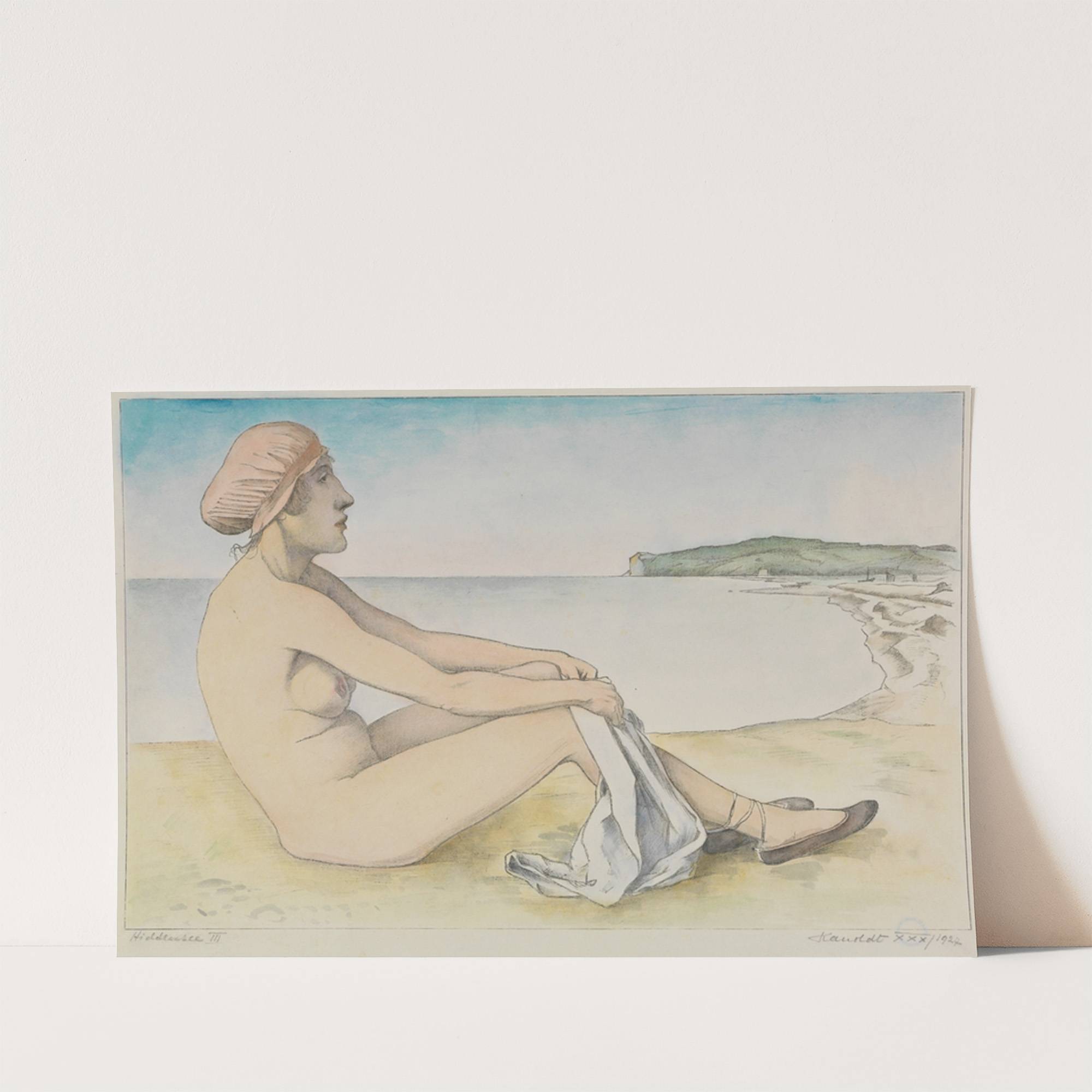 This beautiful print, titled "Hiddensee III" by the artist Alexander Kanoldt, features a delicate watercolor depiction of a serene beach scene. The central figure is a woman with fair skin, seated on a sandy shore. She has an hourglass figure...