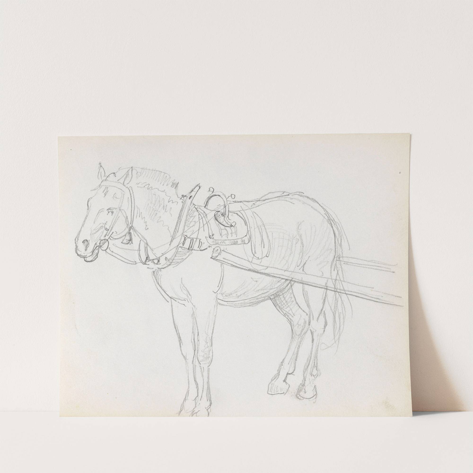 This elegant line drawing captures the classic simplicity of an equine subject in a realistic yet minimalist style. Created by artist Adolph Tidemand between 1865 and 1872, this sketch features a standing horse, meticulously detailed with fine, precise lines that...