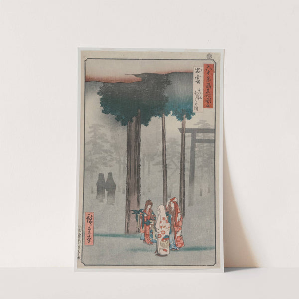 This art print features "Hotohoto Festival at Izumo Grand Shrine," a captivating ukiyo-e woodblock print by renowned Japanese artist Andō Hiroshige. The scene is set during the Hoto Festival, capturing a moment of traditional Japanese culture. In the foreground, four...