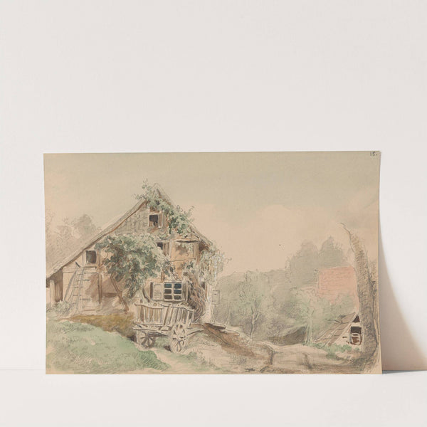 This charming watercolor print portrays "House by the Road" by Adolph Tidemand, capturing a serene rural scene with remarkable detail. The image features an old wooden house, slightly weathered but welcoming, adorned with climbing greenery that softens its rustic facade....