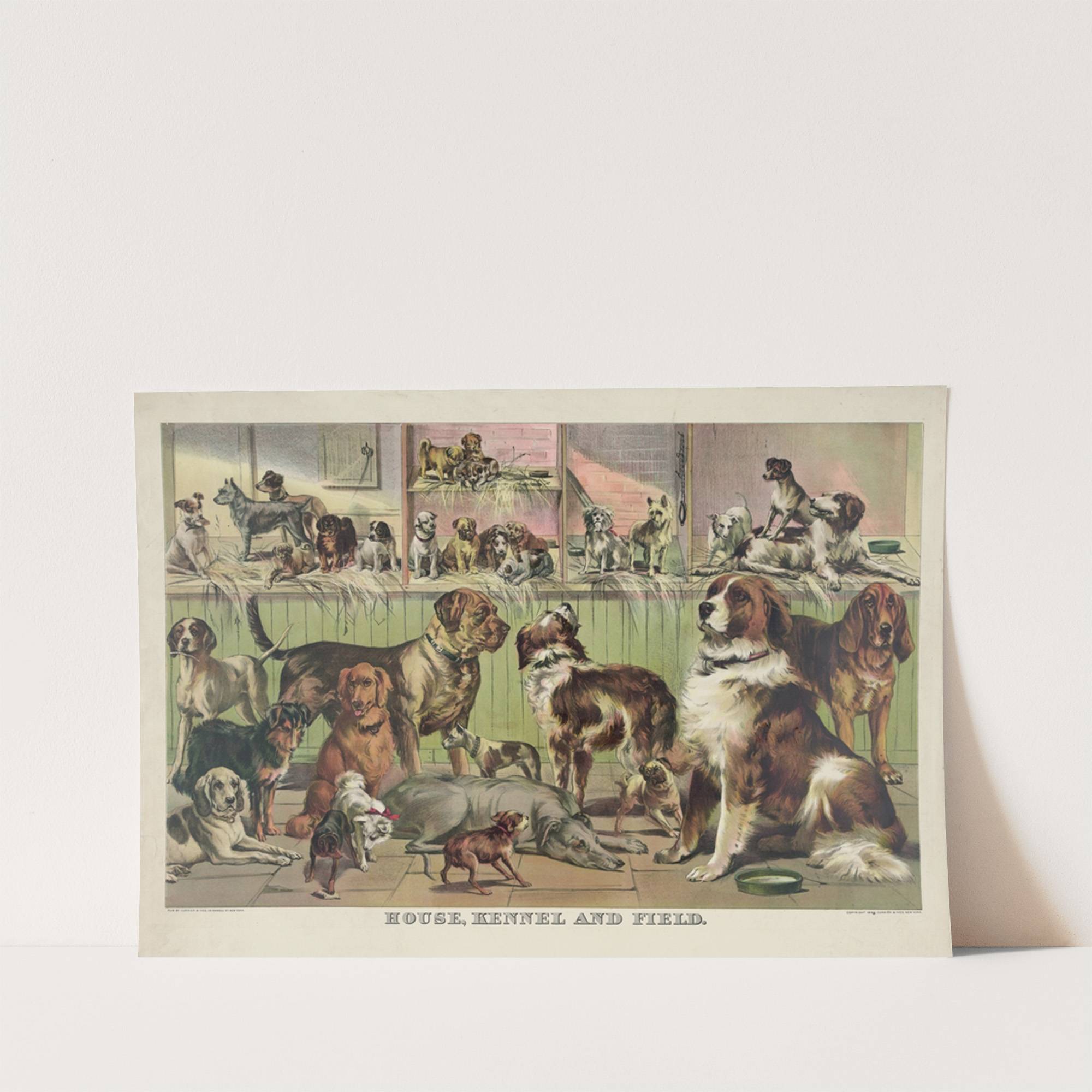 This charming vintage print titled "House, Kennel, and Field" by Currier & Ives captures the lively atmosphere of a bustling dog boarding facility. The illustration features a variety of dogs in different poses, from playful to relaxed, set against a...
