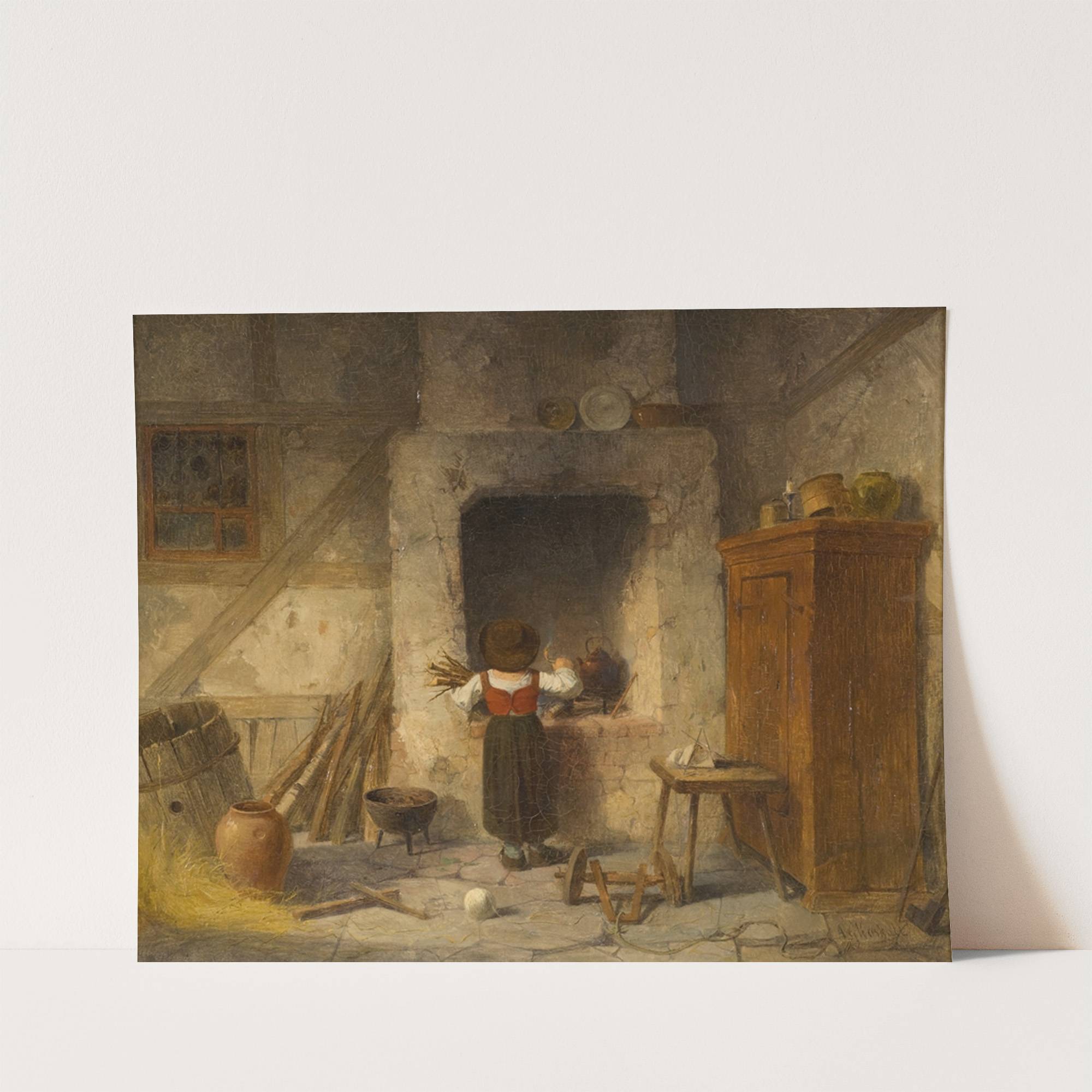 This beautifully painted artwork titled "Household Work" by Anders Gustaf Koskull captures a warm, rustic scene from the late 19th century. In this charming oil painting, we see a young woman with her back to us, tending to a small...