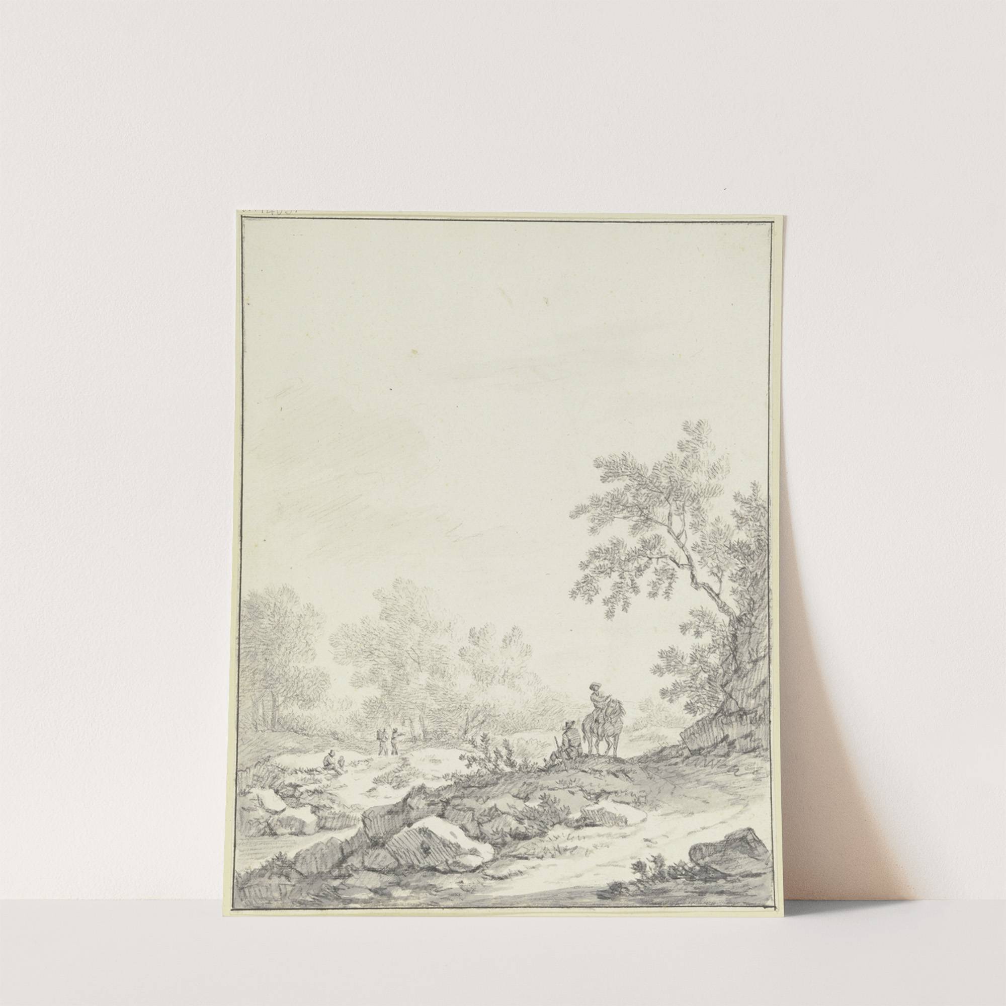 Hügeliges Gelände mit Bäumen und Gestein, im Vordergrund ein Reiter und ein sitzender Mann, links drei weitere Figuren by Johann Christoph Dietzsch - Wall Art Print