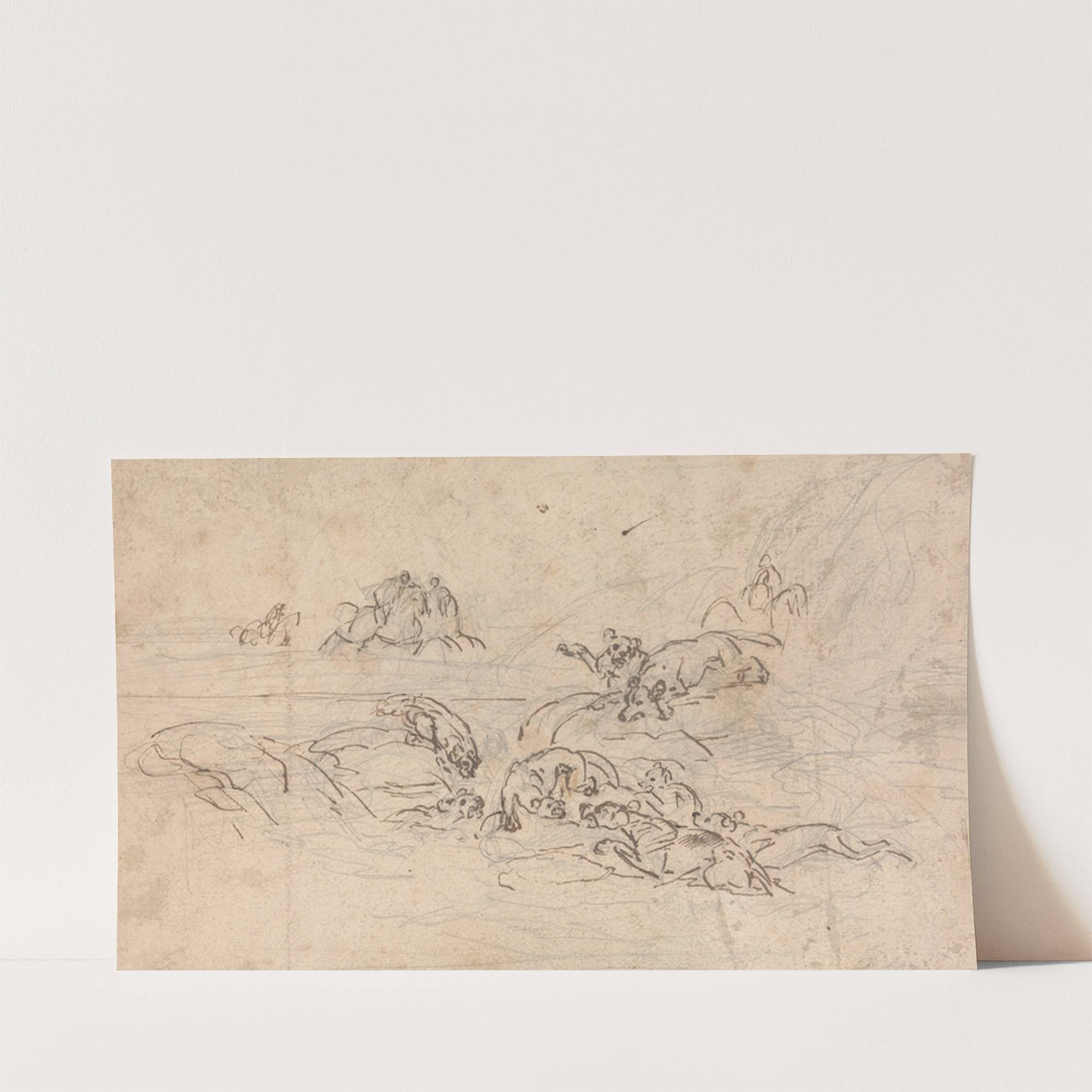 Hunters approaching a lion being held at bay by hounds by Sawrey Gilpin - Wall Art Print
