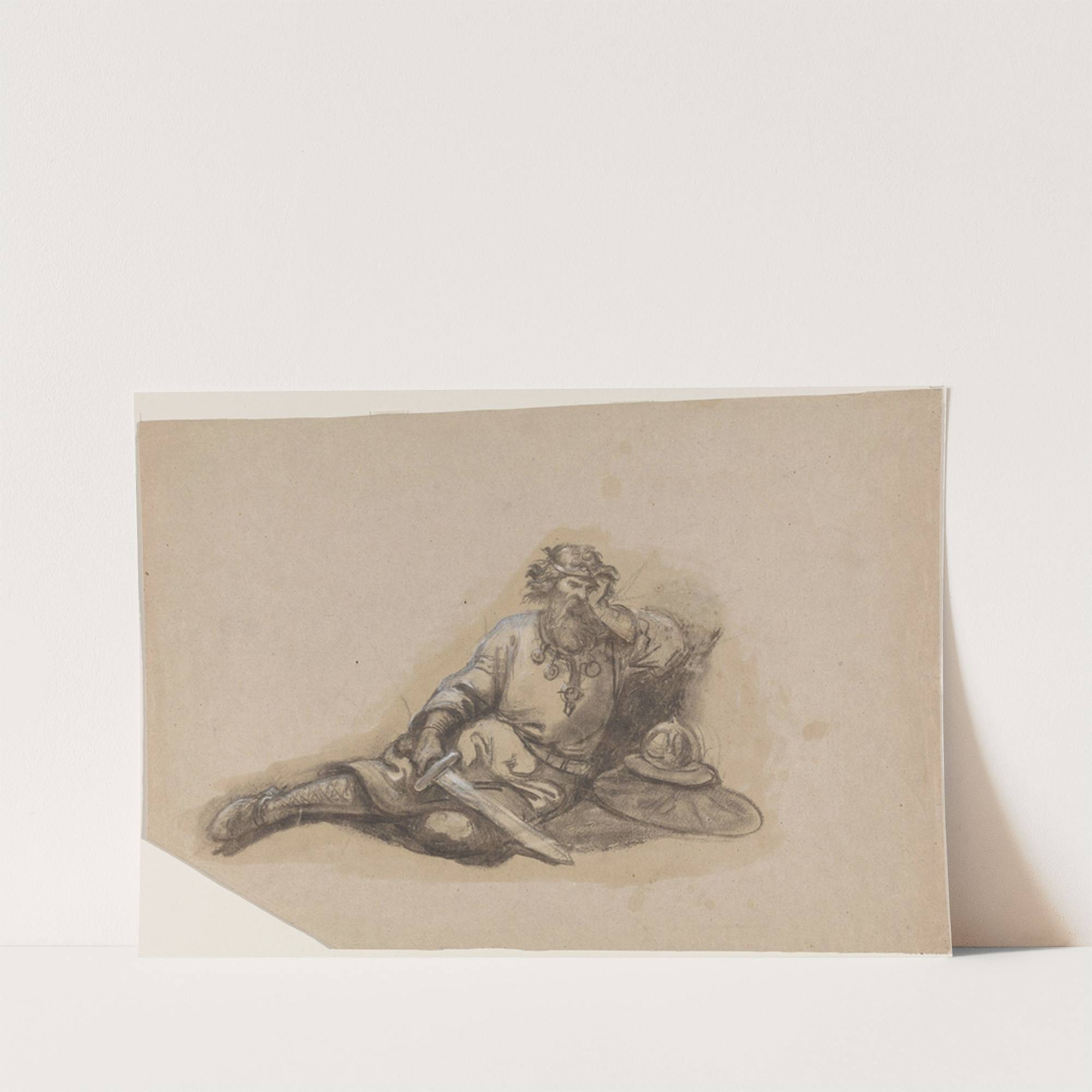 This artwork is a beautifully detailed pencil drawing by the renowned artist Adolph Tidemand, titled "Hvilende mann i rustning," which translates to "Resting Man in Armor." The piece features a bearded man in traditional medieval armor lying down in a...