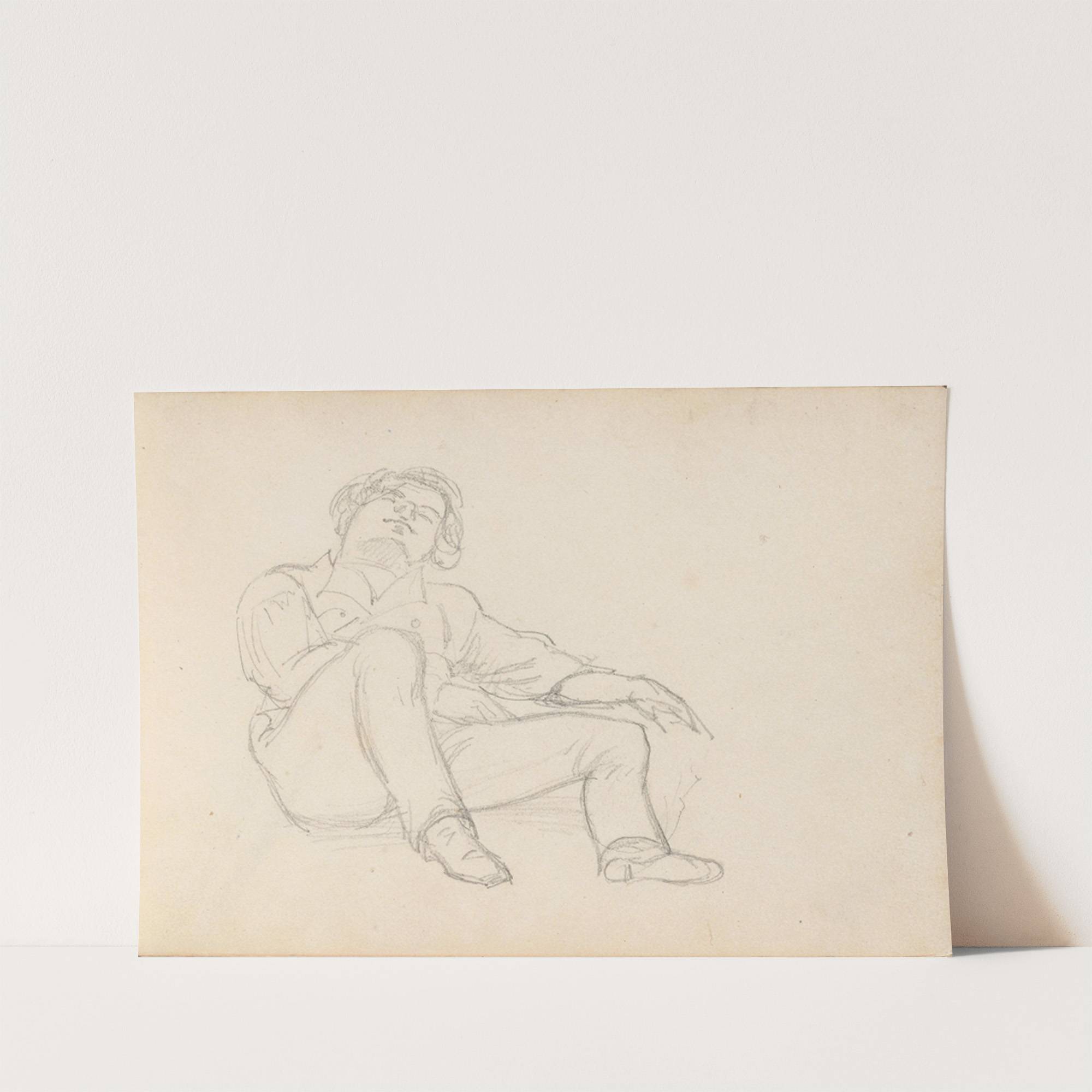 This minimalist sketch captures the serene contemplation of a seated man from Adolph Tidemand's "Hvilende mannsfigur," created in 1838. The pencil lines delicately outline the man's figure, emphasizing his relaxed posture and thoughtful expression. He is seated with his legs...