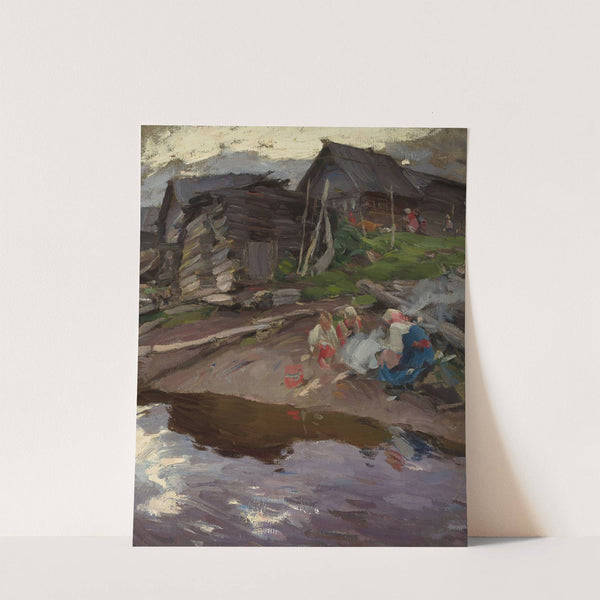 This evocative painting, "In the Evening" by Abram Efimovich Arkhipov, captures a serene yet rustic village scene at dusk. The artist uses bold, expressive brushstrokes to bring life and texture to the composition. In the foreground, a wooden boat rests...