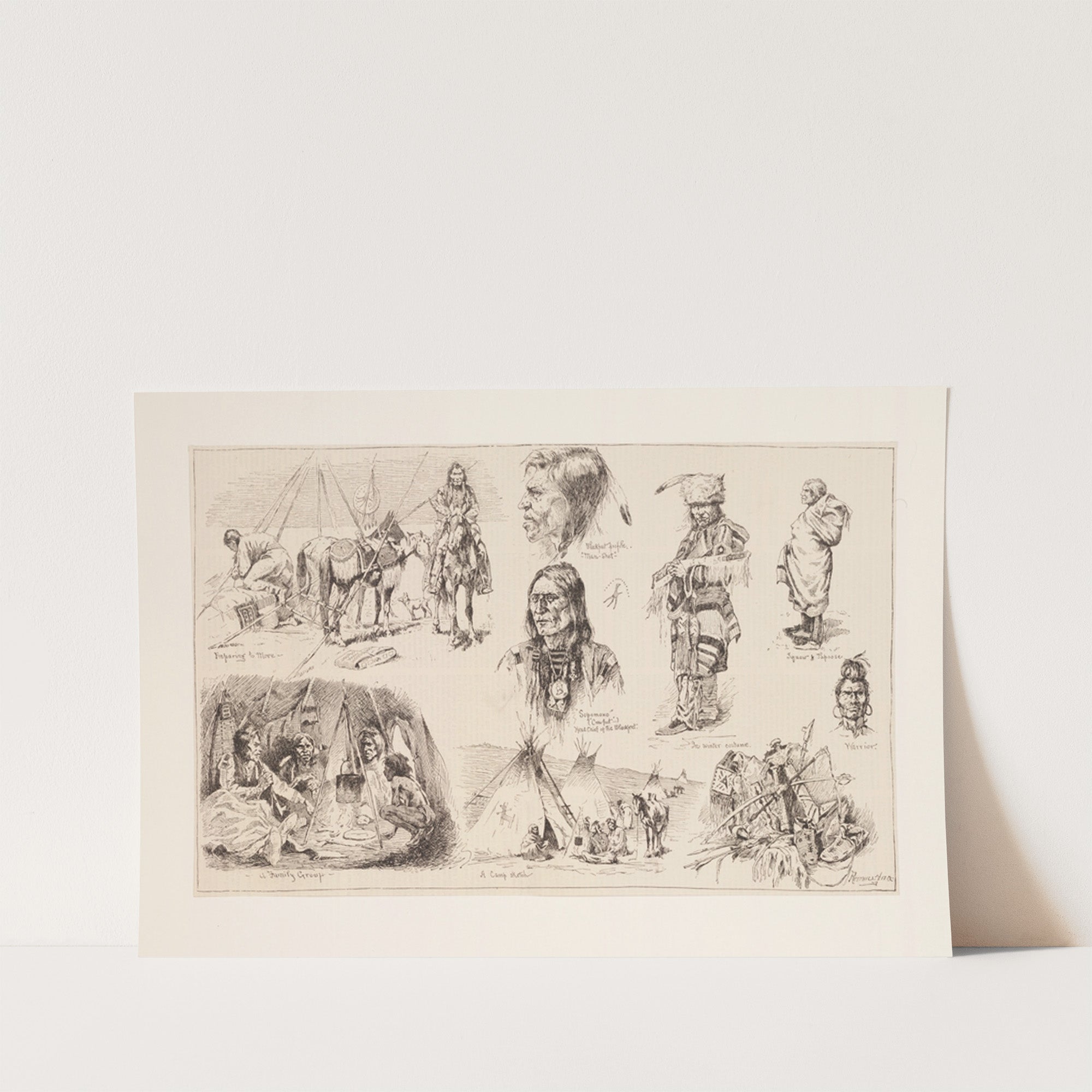 This black-and-white sketch collection features a series of illustrations by artist Frederic Remington, capturing various scenes from life in the American West. Each piece is meticulously detailed with fine pencil work that brings out textures and expressions vividly.At the center,...