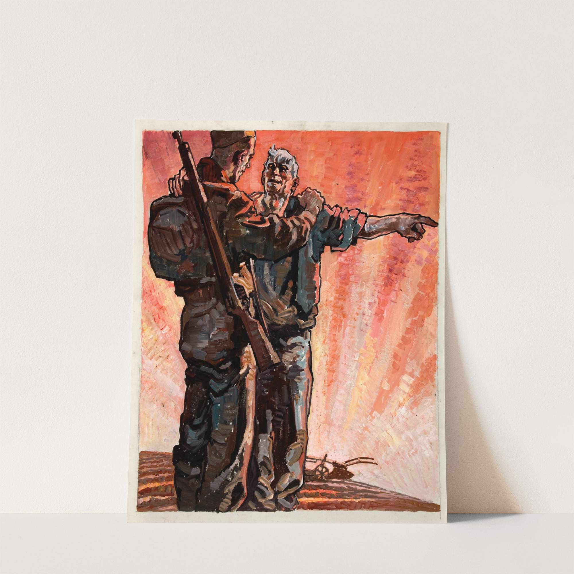 Infantryman receiving directions from old ploughman, each with hand on other’s shoulder by Augustus Jansson - Wall Art Print