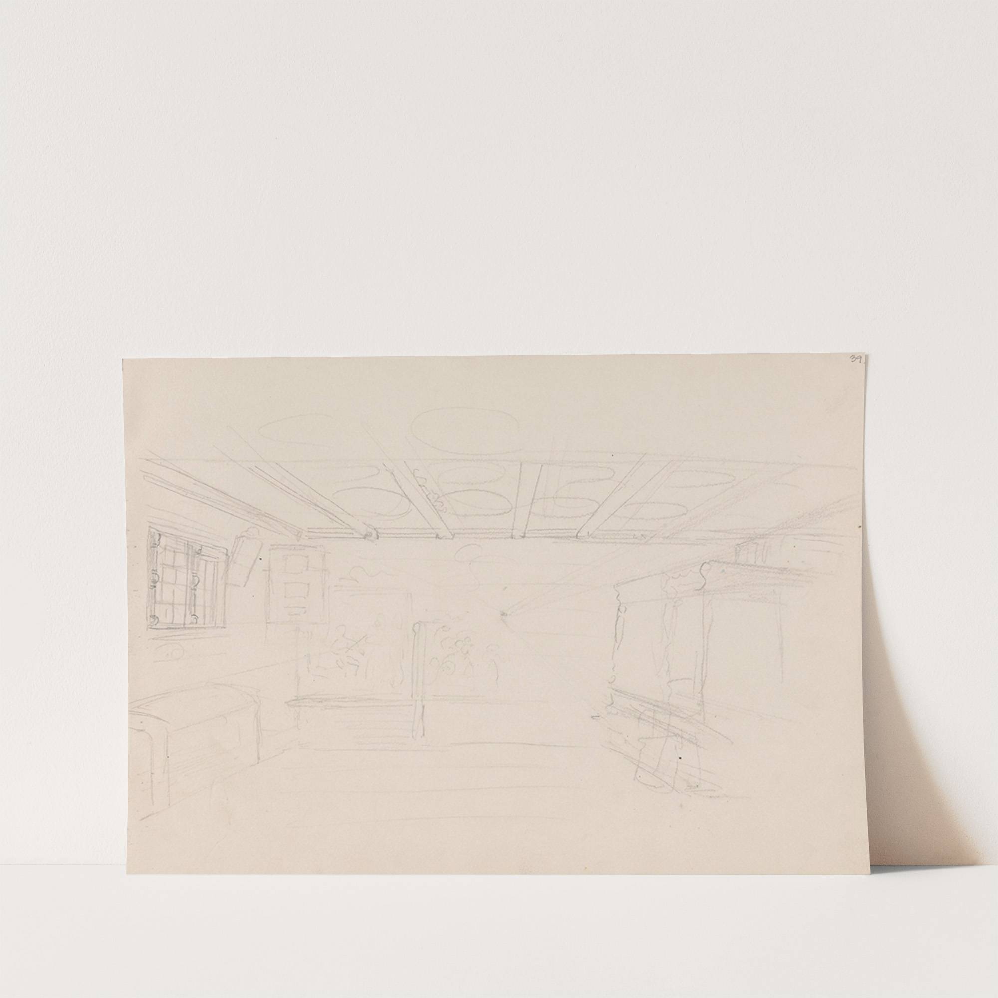 This minimalist line drawing captures the interior of a room with an emphasis on its structural elements. The artist uses fine, delicate lines to depict the architectural details, creating a sense of depth and perspective without color or shading. On...