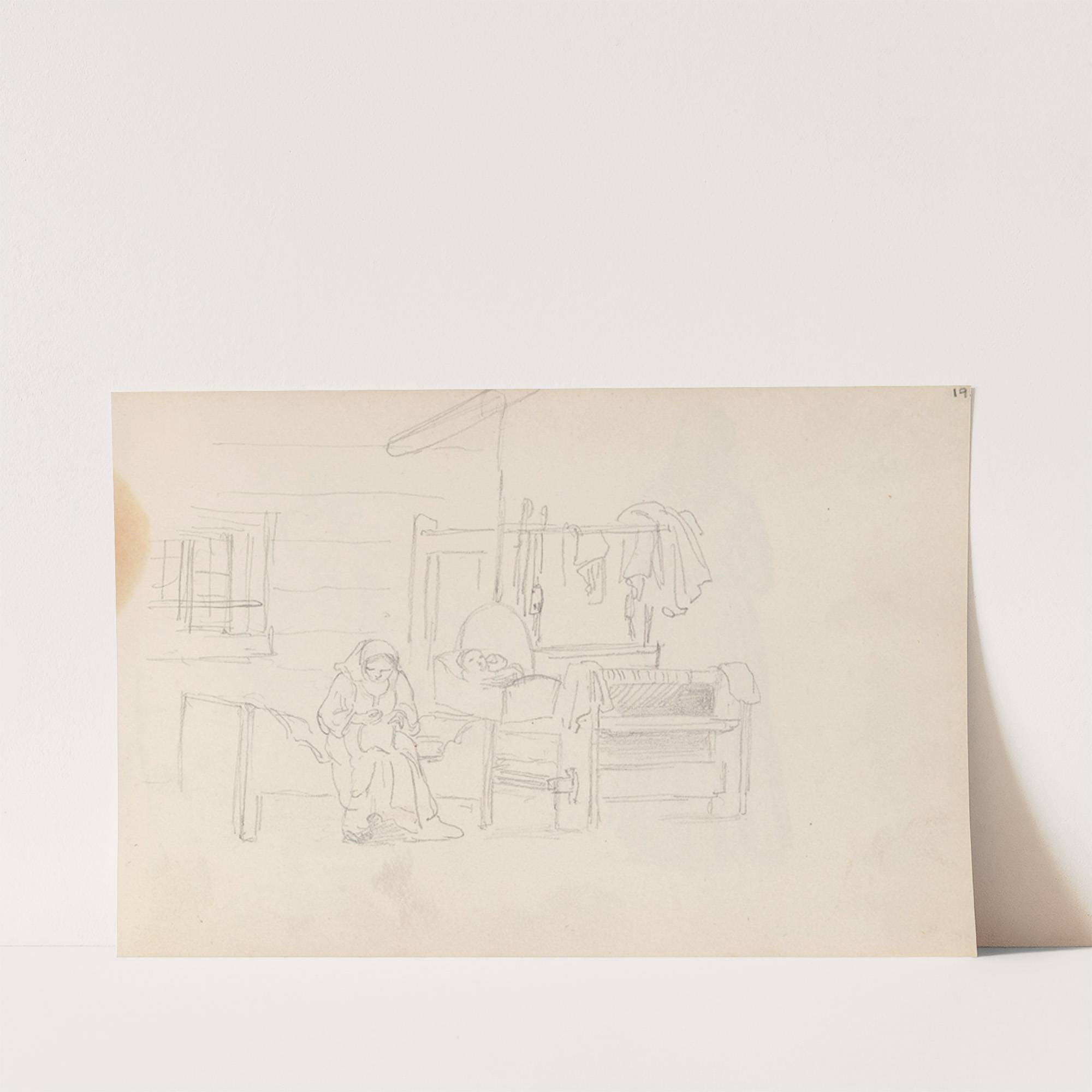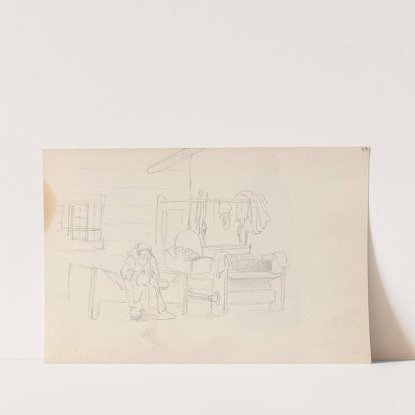 This art print features "Interiør med seng, hengevugge, vev og figurer" by Adolph Tidmand, rendered in a delicate, minimalistic line drawing style. The scene captures a tranquil domestic interior with a focus on subtle, clean lines that create a soft,...