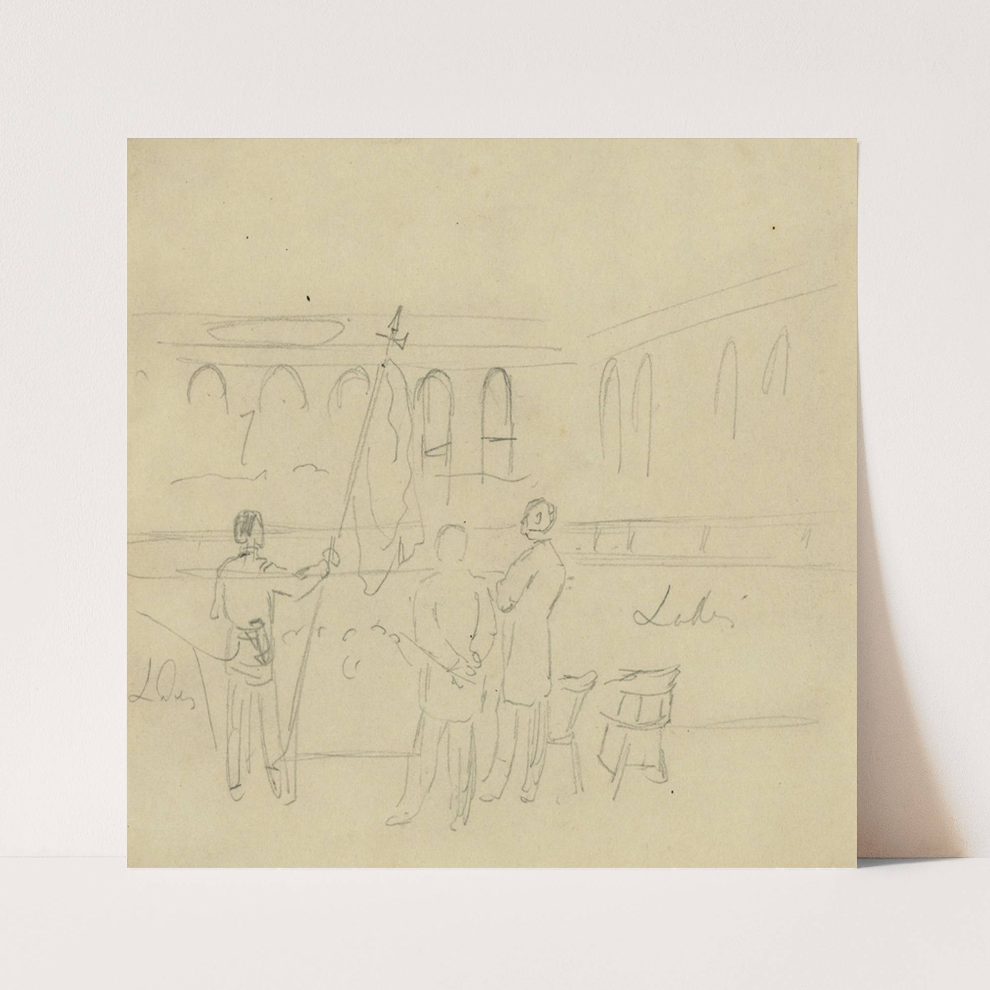 Interior of hall with three figures on a stage by Alfred Rudolph Waud - Wall Art Print