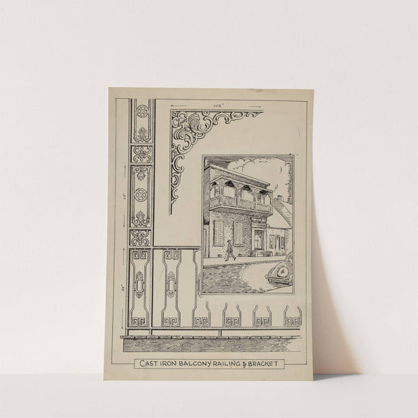 This elegant art print features "Cast Iron Balcony Railings in Backet" by Al Curry. The black-and-white illustration is meticulously detailed with intricate line work that highlights the ornate cast iron railings on a vintage balcony. The railing design includes classical...