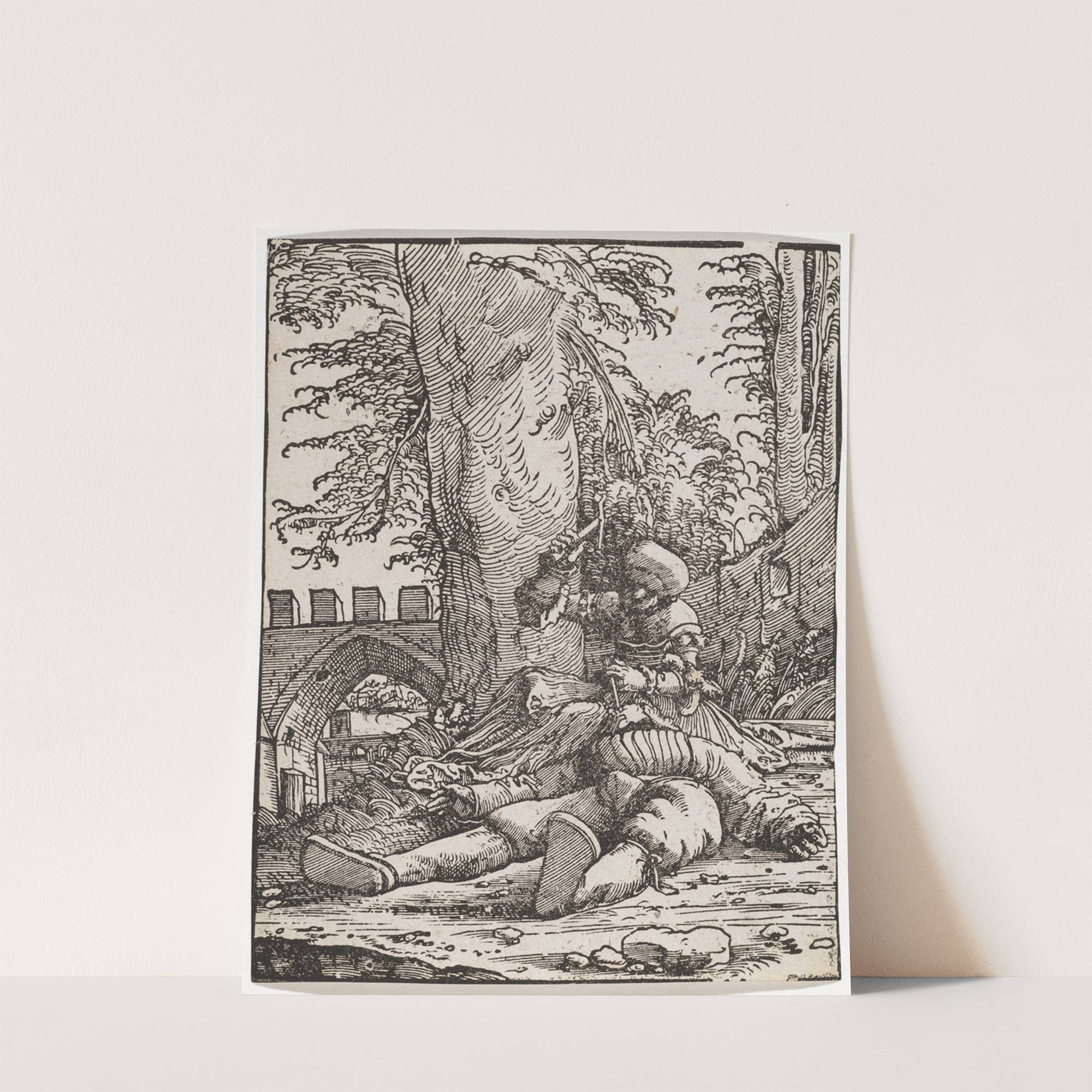 This black-and-white artwork is a detailed and dramatic illustration of "Jael tötet Sisera," created in the style of Albrecht Altdorfer, a renowned German artist. The scene depicts an intense and tragic moment from biblical history, rendered with intricate line work...