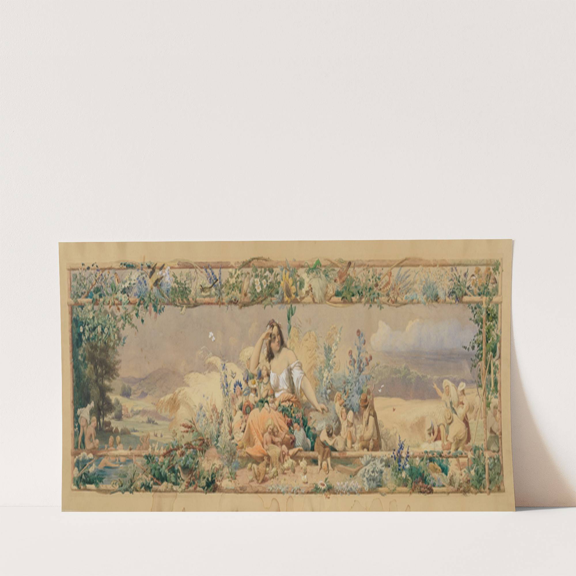 This art print features "Jahreszeitenzyklus; Der Sommer" by Adolf Schröter, an exquisite example of classic realist painting. The composition beautifully captures the essence of a summertime scene. At its center, a serene pastoral landscape unfolds with detailed foliage and flora...