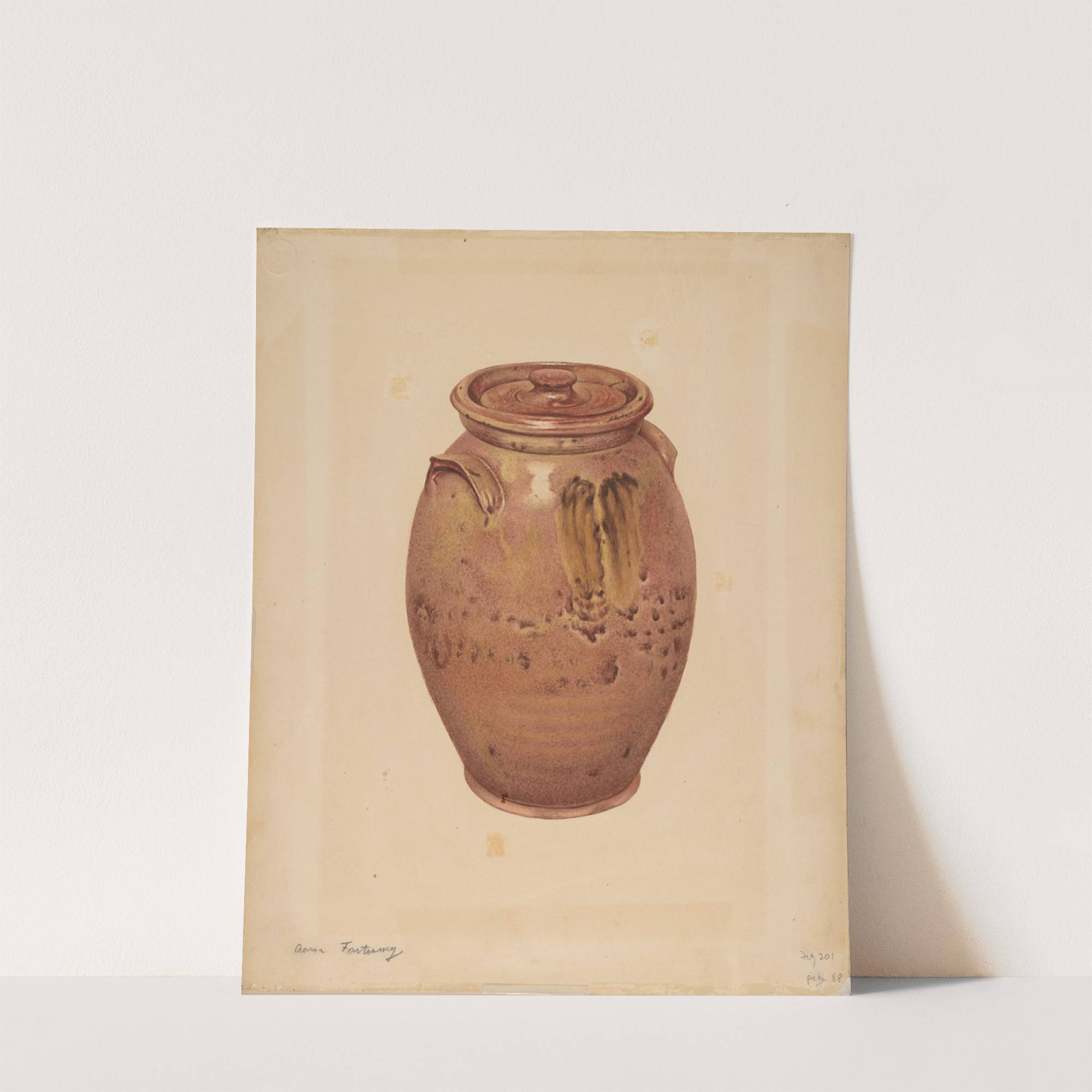 This artwork titled "Jar" by Aaron Fastovsky showcases a meticulously detailed ceramic jar rendered with rich, earthy tones of reddish-brown and ochre. The jar features a rounded, bulbous body that slightly tapers towards its base and is adorned with subtle,...