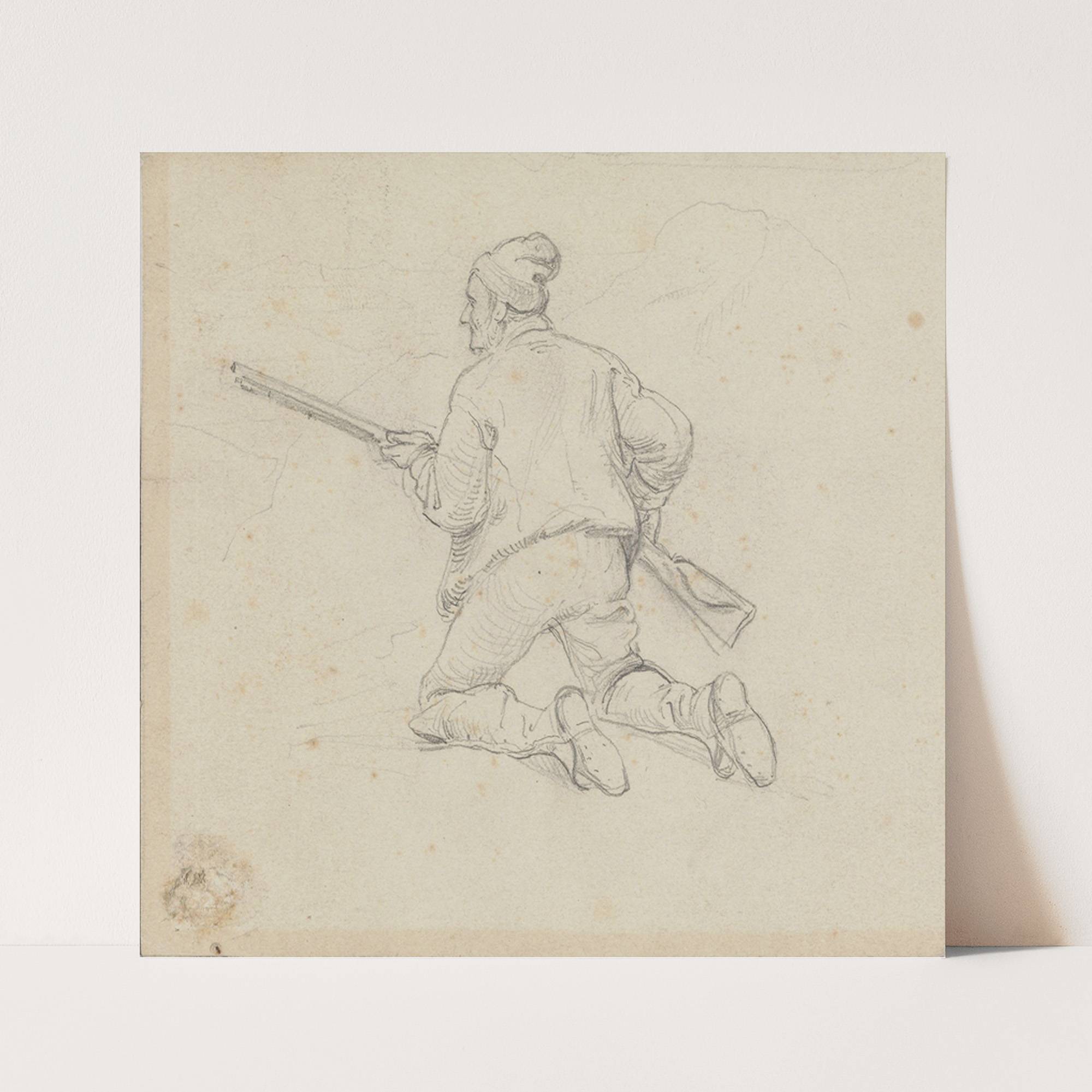 This piece is a meticulous pencil sketch titled "Jeger på kne" by Adolph Tidemand, capturing the dynamic posture of a hunter in action. The hunter is depicted from a rear angle, showing him kneeling with his body slightly twisted to...