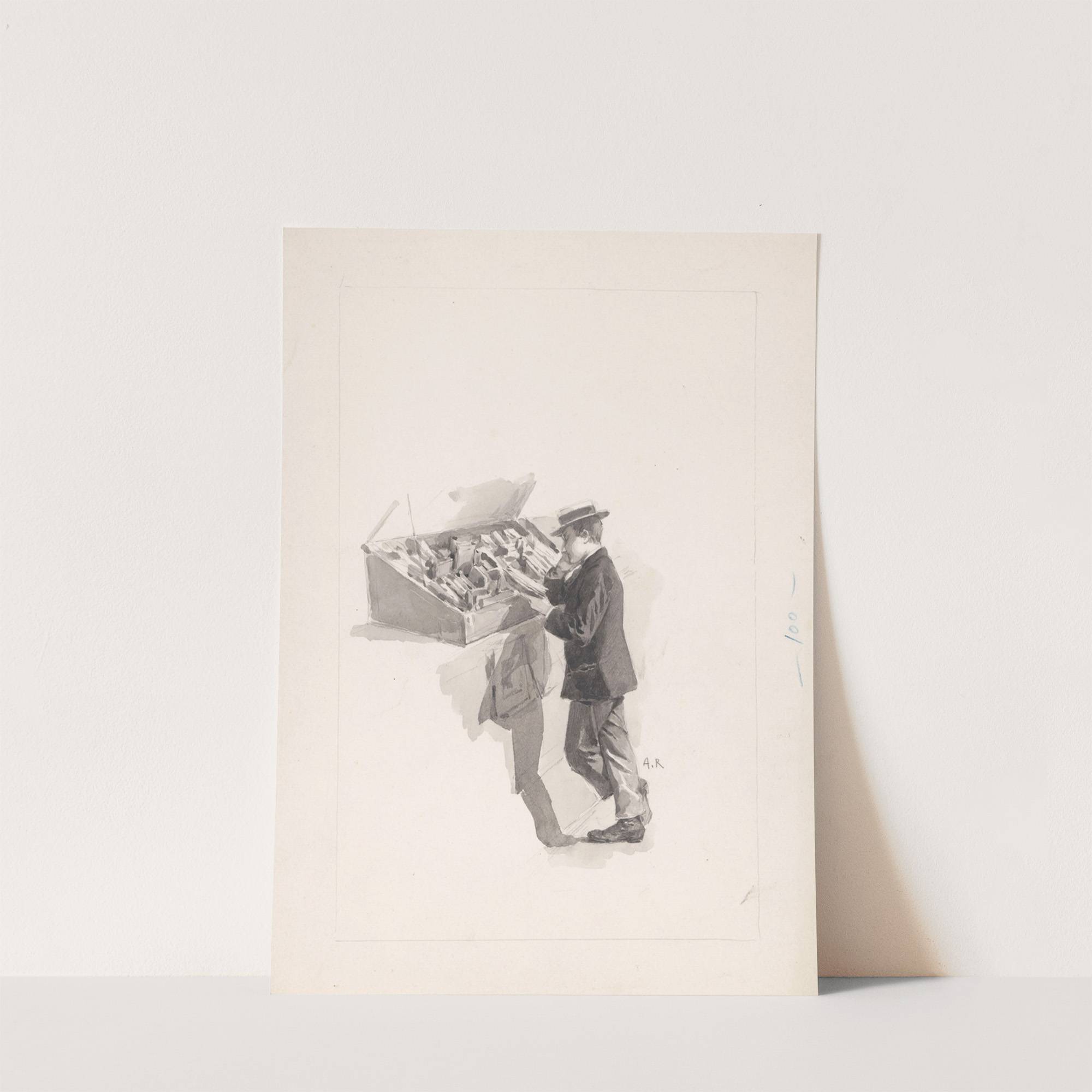 Jongen leest een boek voor de vitrine van een boekhandelaar by Alcide Théophile Robaudi