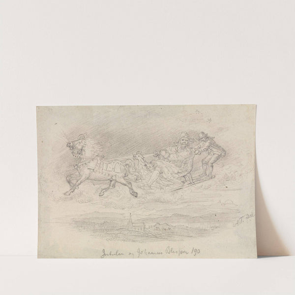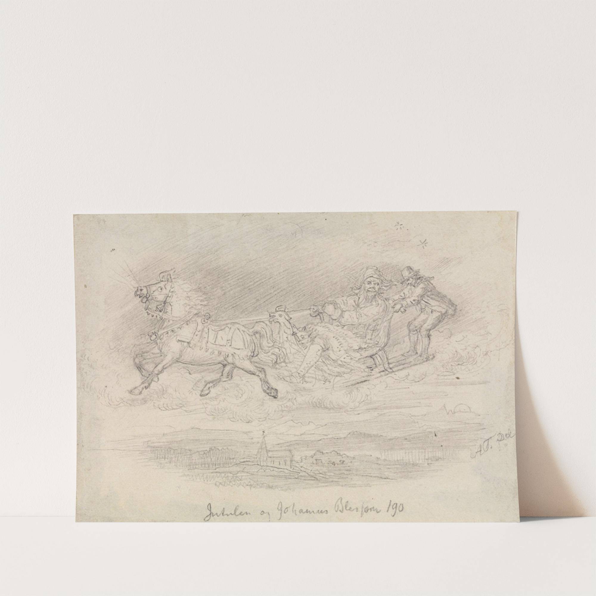 This striking monochromatic sketch by the esteemed artist Jutulén captures a dramatic moment from "Johannes Blessed" by Adolph Tidemand, created circa 1850. The drawing features a chaotic scene where galloping horses are in motion with riders clad in traditional Norwegian...