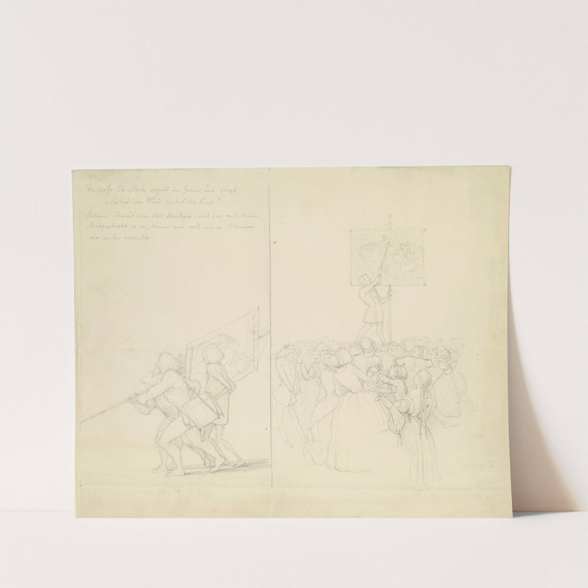 This art print features a delicate pencil sketch by artist Karikatur aus Anlaß des Ankaufs von Lessings ‘Hus vor dem Konzil in Konstanz’ durch das Städel’sche Kunstinstitut by Adolf Schröder. The image is divided into two panels, each capturing a...