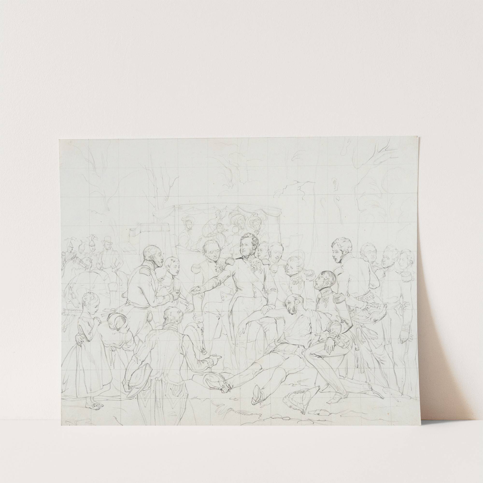 This line drawing captures the historical scene "King Louis-Philippe Tending His Courier" by Alfred Johannot, showcasing an intricate depiction of the monarch amidst his courtiers. The monochromatic sketch employs delicate, precise lines to portray a gathering of figures in regal...
