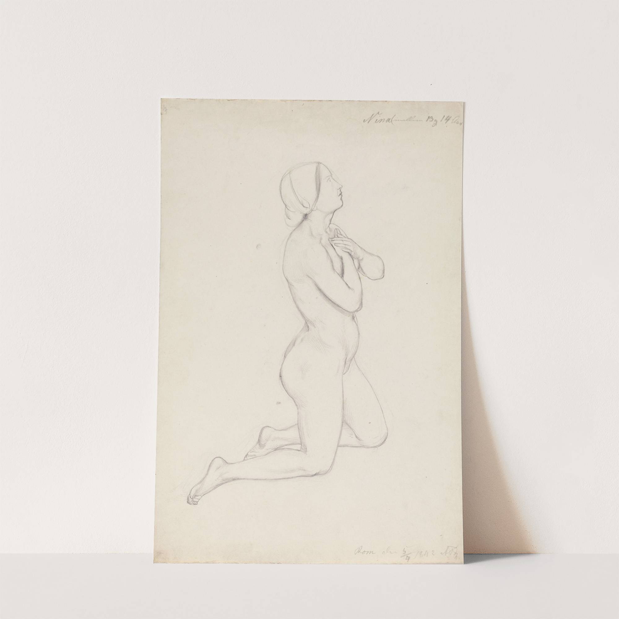 This elegant art print features "Kneelende kvinneakt" by Adolph Tidemand, created in 1842. The drawing is rendered in delicate pencil lines on white paper, capturing the timeless beauty and grace of a kneeling figure. The subject is a woman with...